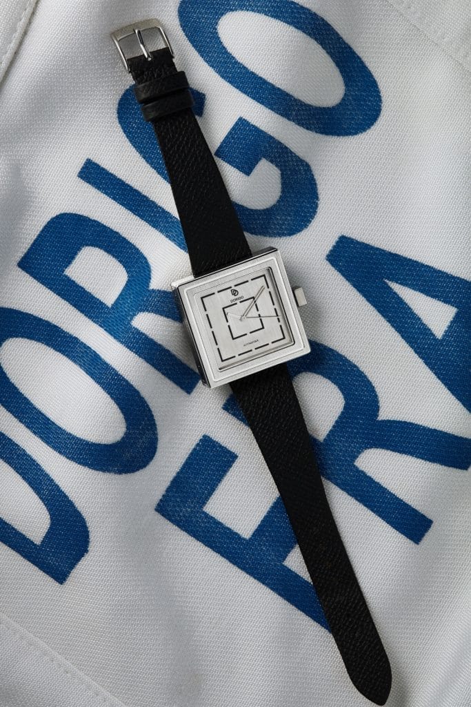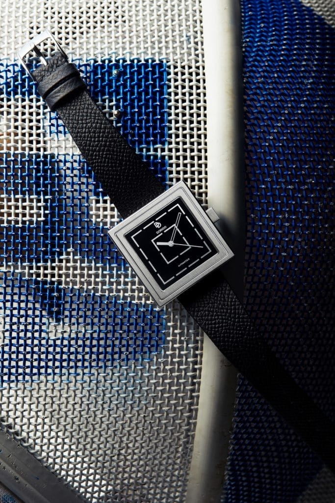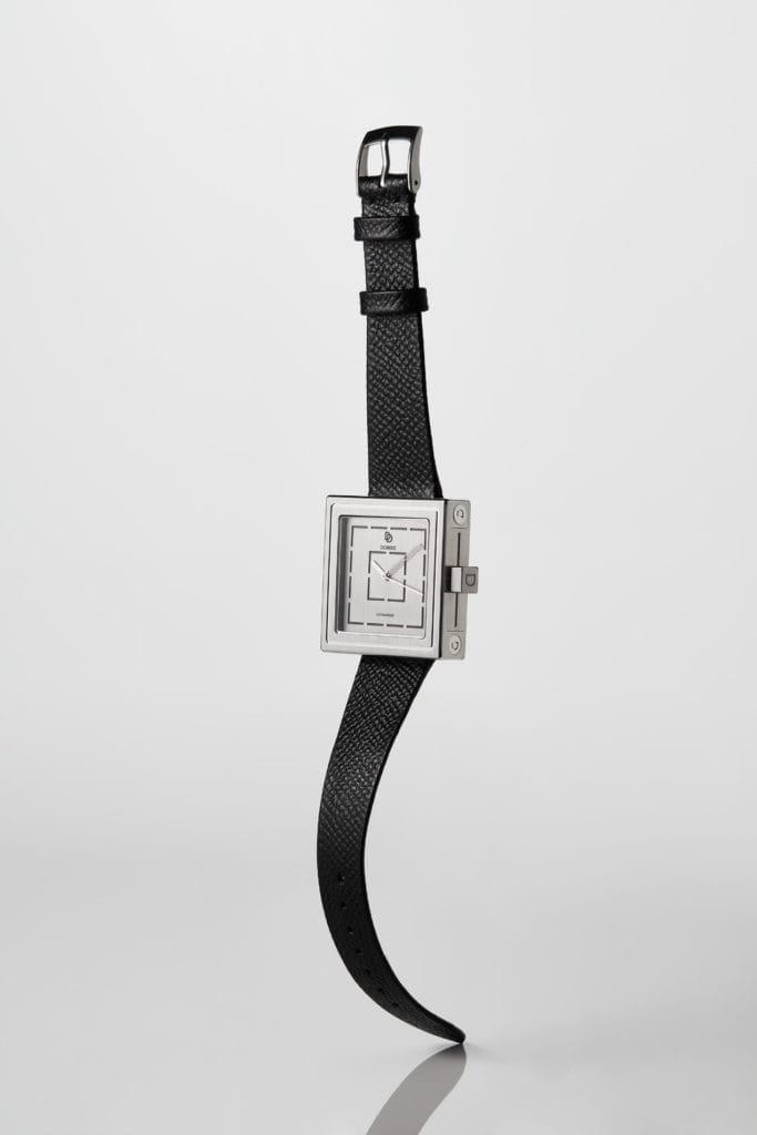 Chaque montre est un hommage à la modernité française : un design carré rainuré de 36 mm, un cadran sandwich en relief et un bracelet en cuir grainé cousu main.