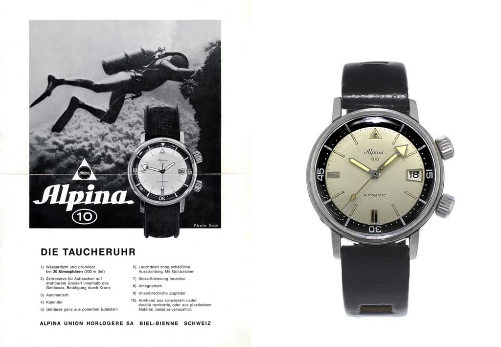 À son lancement en 1969 par Alpina, la première montre de plongée « Seastrong 10 » possédait deux couronnes, dont une destinée à contrôler la lunette tournante interne, permettant de mesurer une durée écoulée grâce à une échelle de 1 à 60 minutes. Elle était alors étanche jusqu’à 200 mètres, antimagnétique et dotée d’un boîtier Super Compressor caractéristique.