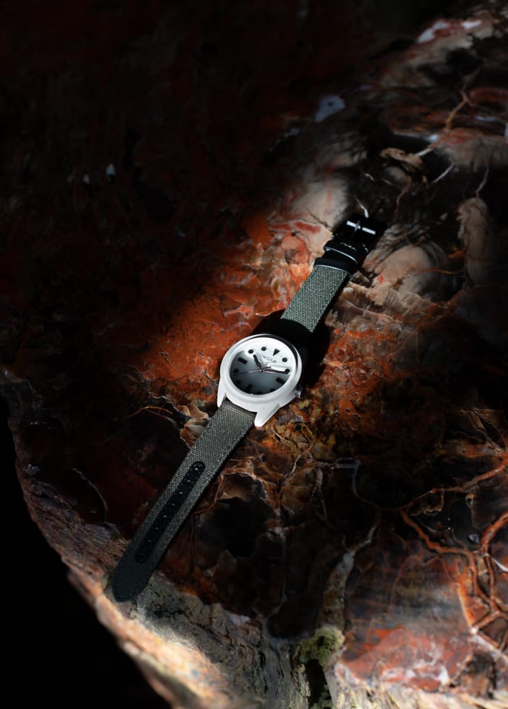 • Boîtier en filets de pêche recyclés et renforcé à la fibre de verre : composite technique élaboré à partir de filets de pêche collectés dans les mers d’Europe du Nord, recyclés puis renforcés à la fibre de verre à haute pression. Ultra léger, seulement 29 grammes, et hautement durable, il possède une qualité, une texture et une résistance inégalée… Un matériau que l’on surnomme au sein de la marque comme le nouveau « carbone des océans »