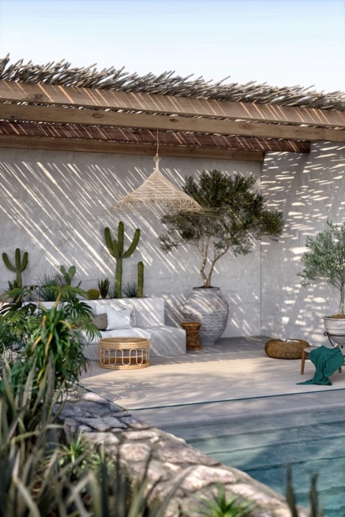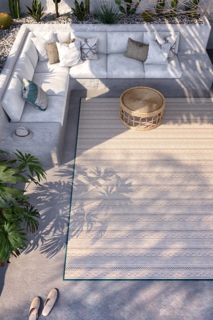 Les motifs géométriques de Sari mêlent bleu azur, ocre et beige pour une ambiance solaire. Les autres références jouent la carte de la sobriété chic : beiges épicés, gris graphite, tonalités sablées. Une palette pensée pour s’accorder aussi bien avec une terrasse bohème, une suite hôtelière en bord de piscine ou un salon ouvert sur la nature.