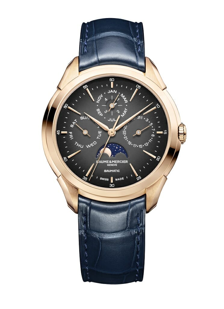 C’est une grande complication poétique qui compose avec le savoir-faire horloger du mouvement Baumatic pour donner vie à un garde-temps fascinant. Heure, minute, seconde, jour, date, mois, année bissextile et phases de lune se partagent un cadran lumineux, offrant un confort de lisibilité optimale. La finesse des index rivés et celle des aiguilles des heures, des minutes et des compteurs, et leurs silhouettes dorées contrastent harmonieusement avec le cadran gris dégradé laqué. A 6h, un disque de lune doré poli et laqué évolue sur un ciel étoilé.