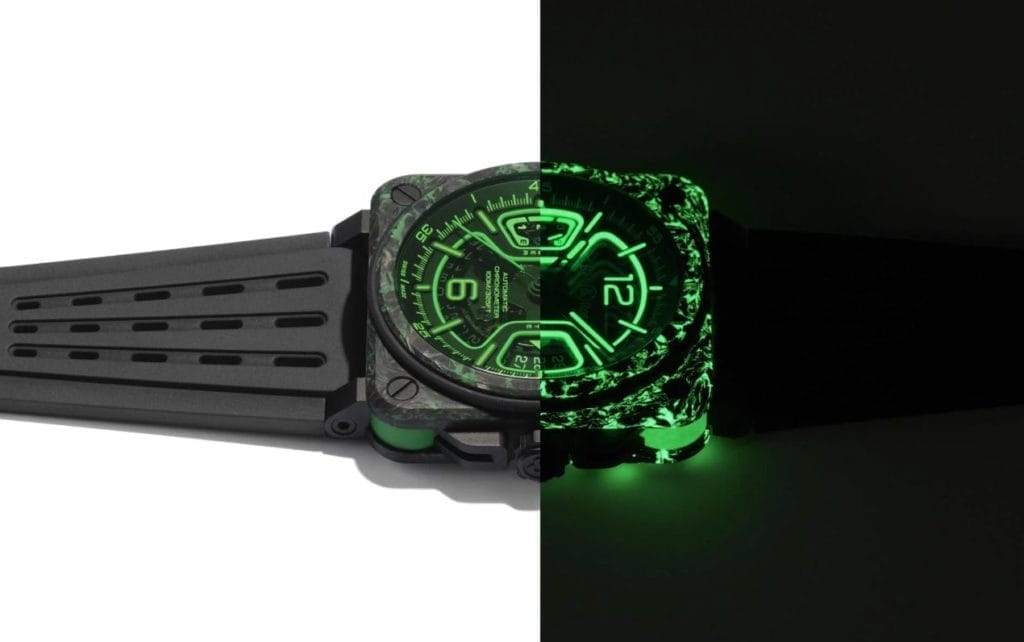 Le boîtier de 41 mm de la BR-X3 Night Vision affiche une construction « sandwich » inédite, combinant plusieurs matériaux de pointe. Les deux plaques principales, réalisées en LUM-CAMO, un composite associant fibre de carbone et résine photoluminescente SLN, assurent robustesse et légèreté.