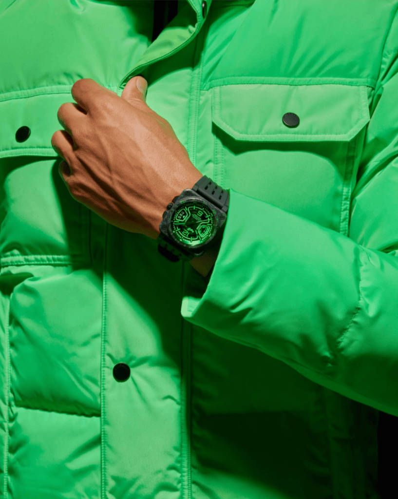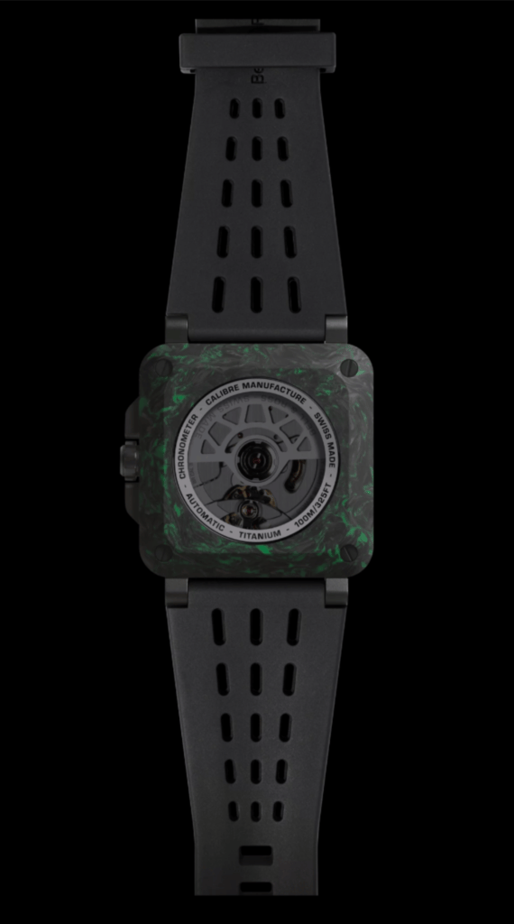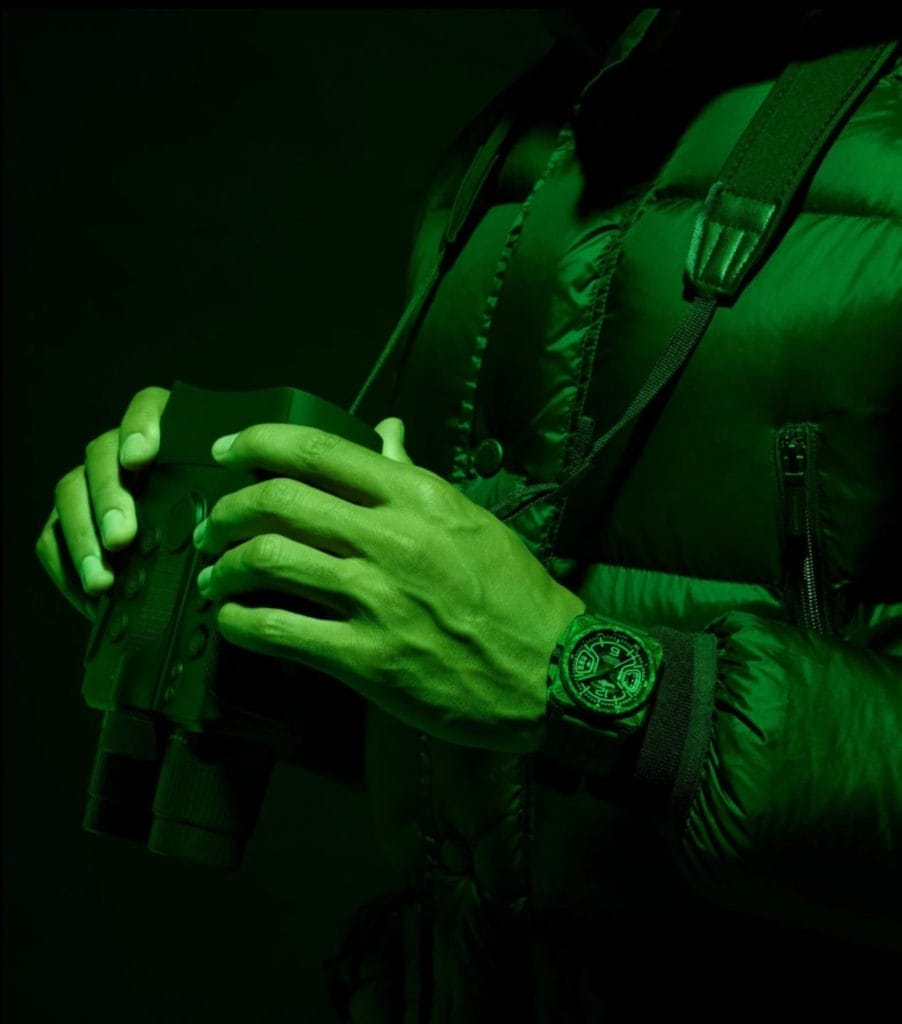 Son cadran squeletté, souligné d’un X photoluminescent vert, offre une lecture parfaite quelles que soient les conditions. Le verre saphir teinté laisse apparaître les détails du mouvement, tandis qu’un verre fumé vert surplombe l’ensemble.
