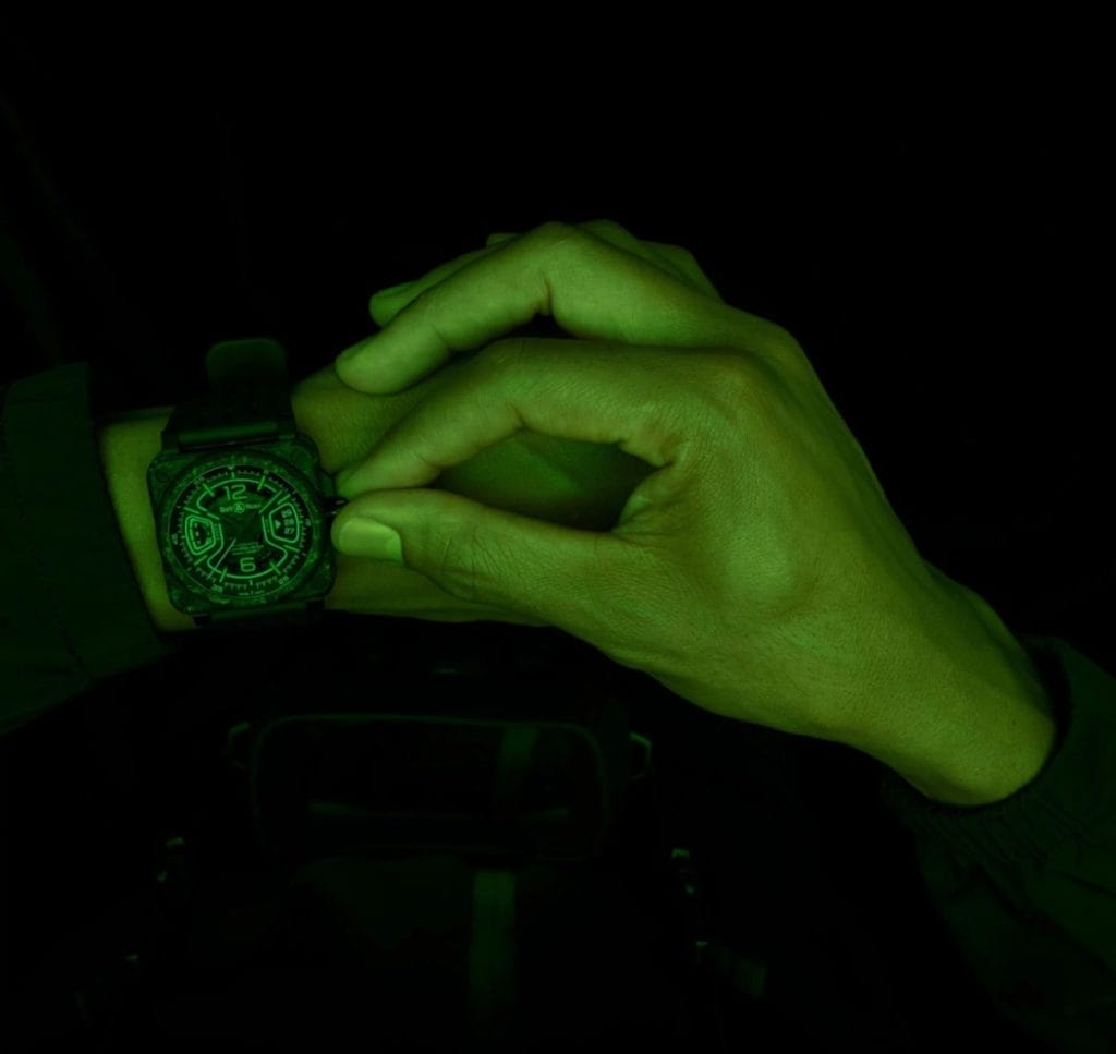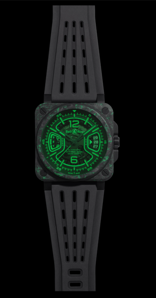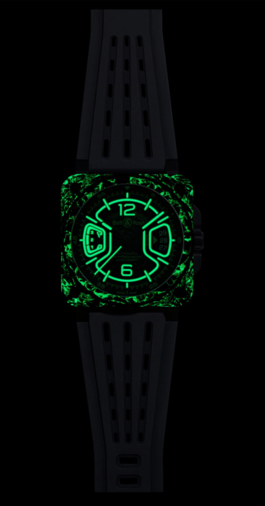 Le boîtier de 41 mm de la BR-X3 Night Vision affiche une construction « sandwich » inédite, combinant plusieurs matériaux de pointe. Les deux plaques principales, réalisées en LUM-CAMO, un composite associant fibre de carbone et résine photoluminescente SLN, assurent robustesse et légèreté.