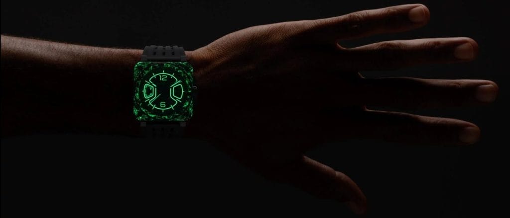 Fixées par quatre vis traversantes, elles encadrent une carrure en titane grade 2 recouvert de PVD noir, tandis que les cylindres latéraux et la lunette en caoutchouc vert luminescent ajoutent une touche techno-futuriste distinctive.