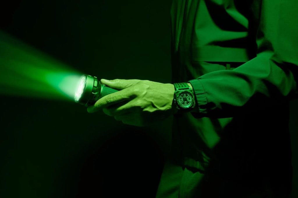 - Boîtier : 41 mm, titane grade 2 microbillé DLC noir, LUM-CAMO, caoutchouc vert luminescent
