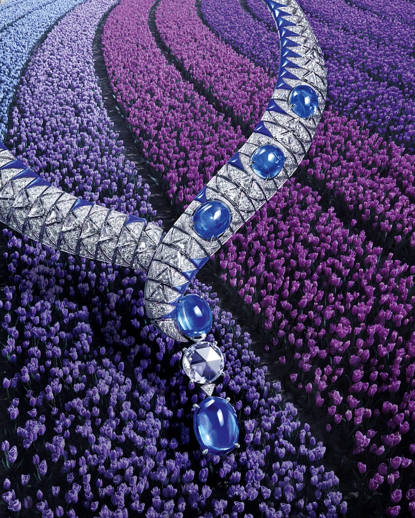 l’orientation ont été rigoureusement étudiés et figés. Reliés entre eux à l’aide de minuscules anneaux de métal, ces innombrables triangles de diamants ou d’émeraudes articulent un tour de cou très souple. Le collier Iwana suit au plus près les courbes du buste et se dépose naturellement sur la peau. Ce confort au porté, qui s’impose comme une évidence, est le fruit d’un véritable savoir-faire Maison.