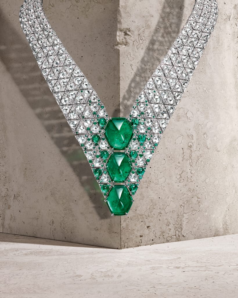 Le motif central est constitué de trois émeraudes de Colombie pour 43,45 carats à la forme singulière : un hexagone taille cabochon aux arêtes très prononcées. Les facettes des cabochons se démultiplient en une trame de motifs triangulaires ajourés, sertis ou pavés de diamants et d’émeraudes.