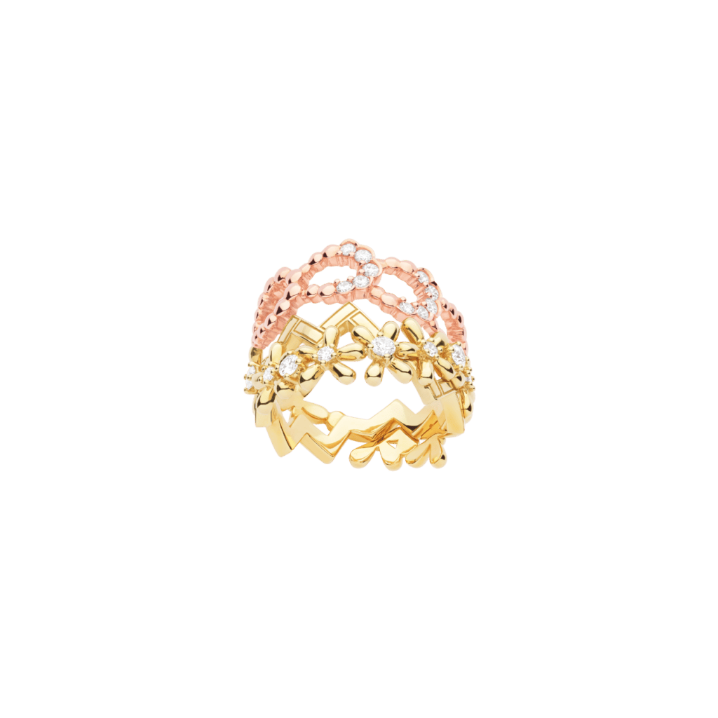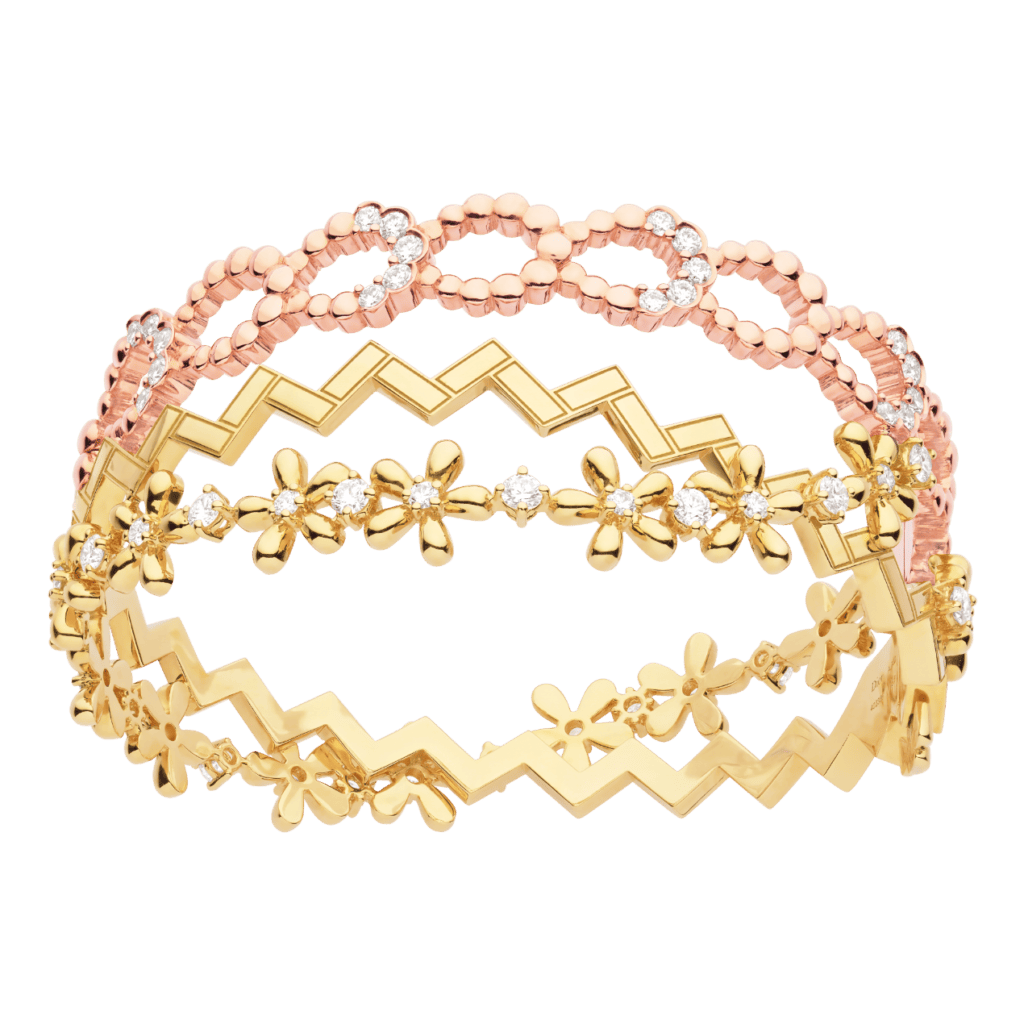 Réalisés en or rose et en or jaune, parfois rehaussés de diamants, les motifs des galons se croisent, s’enchevêtrent, virevoltent, se torsadent, se nouent et s’entrelacent. Ce jeu d’équilibre, de transparence et d’accumulation crée un envoûtant spectacle visuel, incarnant le summum de l’élégance et du raffinement.