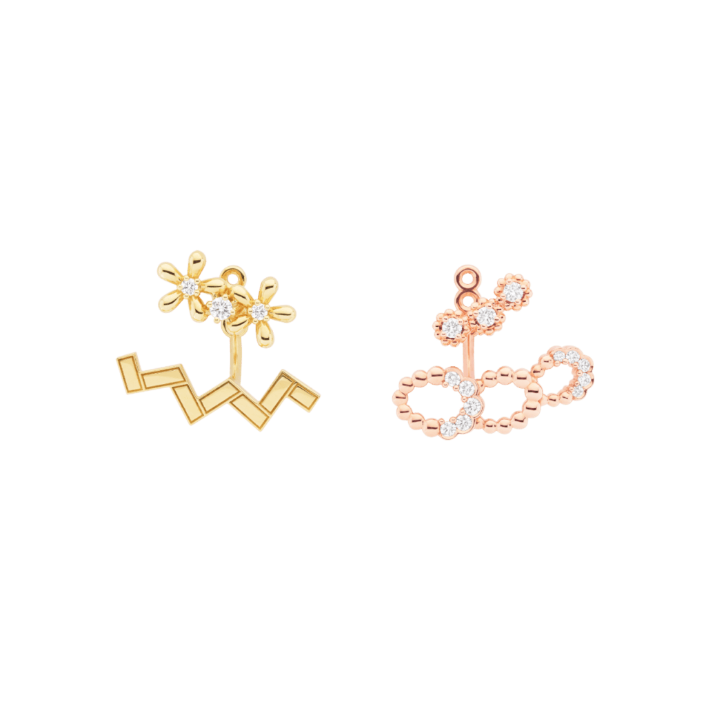 Les nouvelles créations de la collection Galons Dior réinterprètent ce motif traditionnel à travers quatre variations précieuses : le galon Milieu du siècle, le galon fleuri, le galon zigzag et le galon perlé. Chaque variation se déploie harmonieusement sur un collier, un bracelet, une bague et des boucles d’oreilles, offrant une parure complète et cohérente.