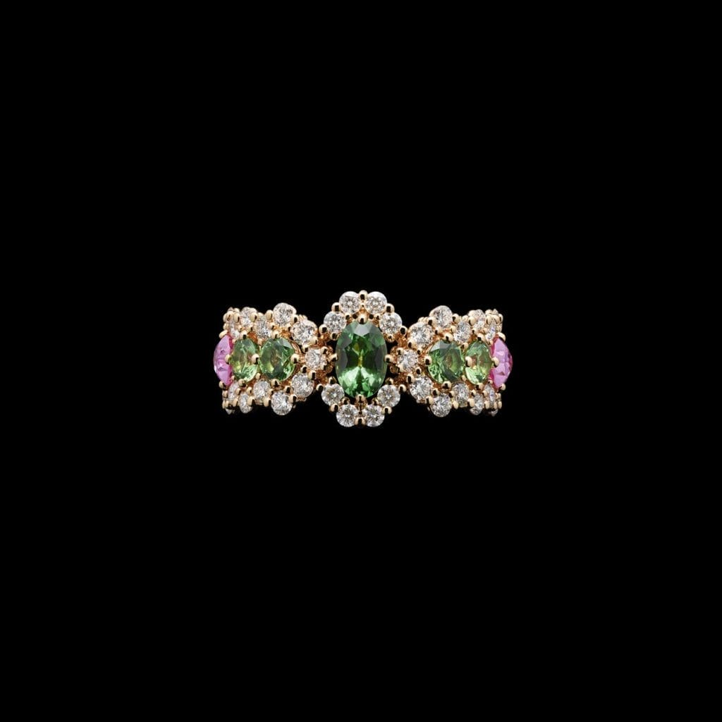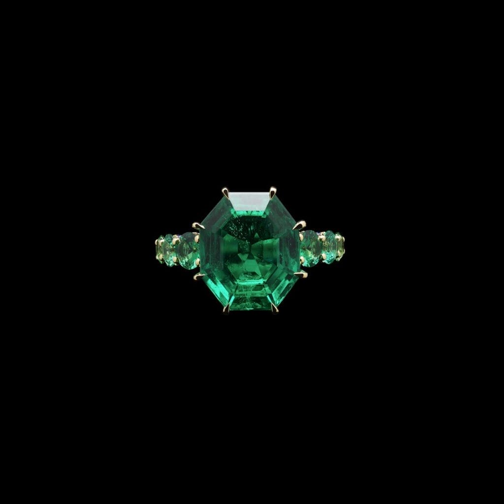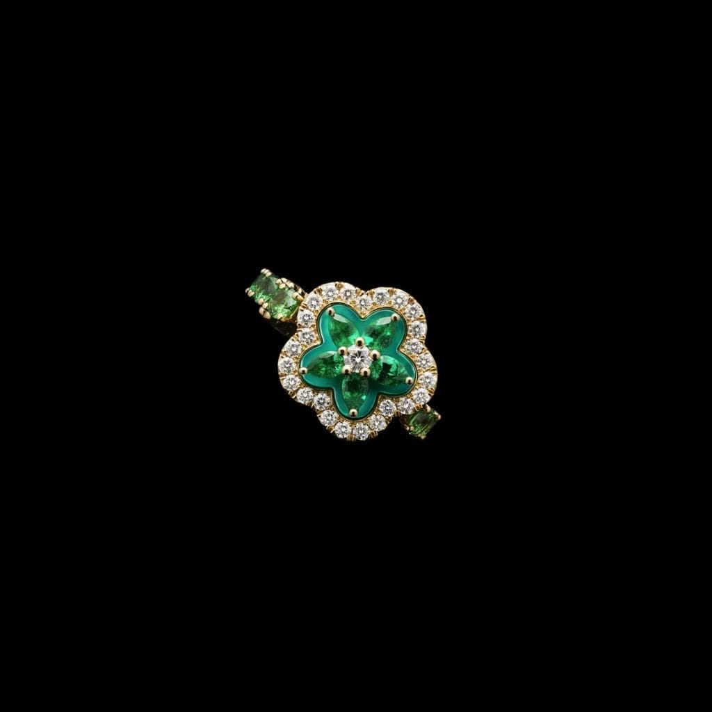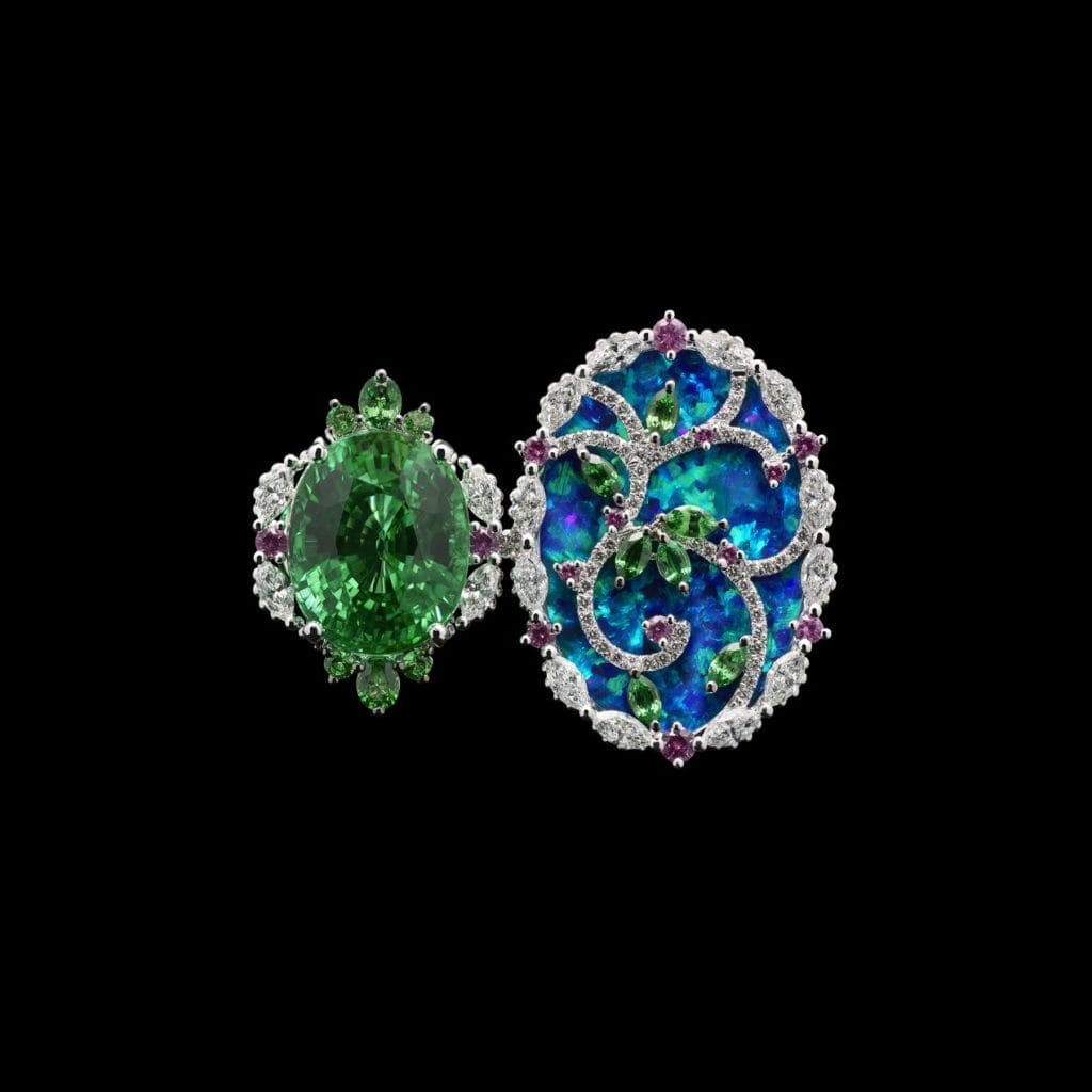 Chaque création est pensée comme une scène. Les compositions jouent sur les volumes, l’agencement des pierres et la manière dont la lumière se déplace sur les surfaces. Ce traitement permet aux bijoux de fonctionner comme de véritables miniatures artistiques .