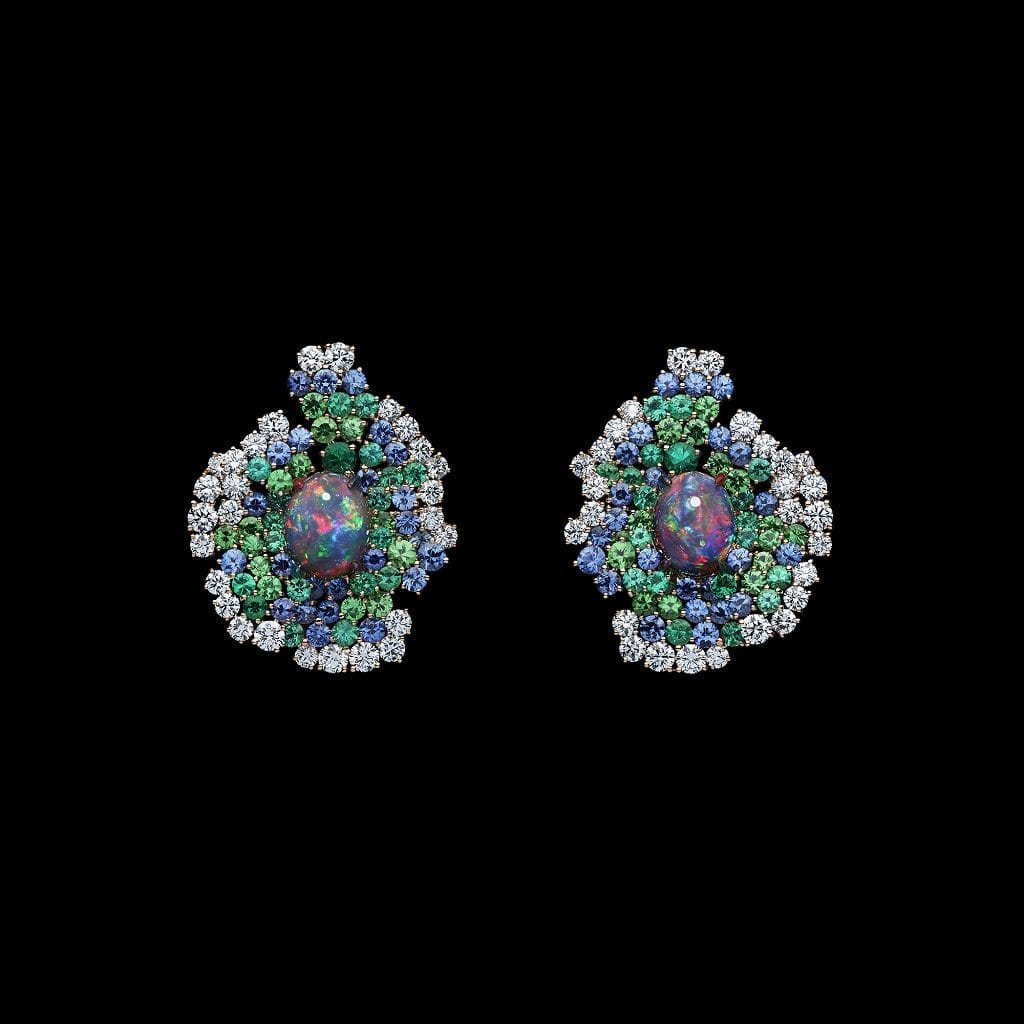 Riche en surprises, cette nouvelle planète abrite aussi une rose futuriste. Elle appelle la vivacité de l’émeraude de Zambie dont les teintes vertes traversées de jaune bourgeonnent en collier, bague et bracelet. Soulignées par des griffes laquées et une monture en or rose, les opales prodiguent leurs feux sur une rose comme pixellisée. A peine décentrées, les perles dorées des mers du Sud forment les pistils d’une fleur stylisée. Graphiques, les pétales se développent autour d’un cœur en spinelle rose ou grenat tsavorite, des pierres choisies pour leurs couleurs complémentaires.