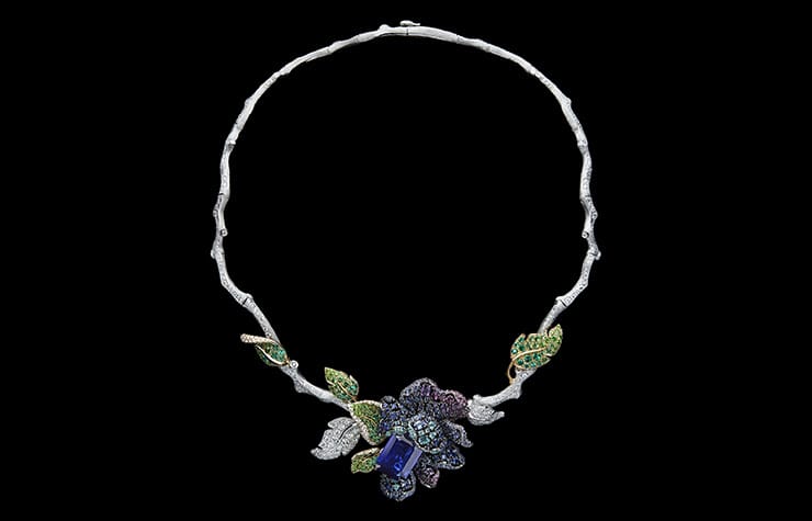 Tel un vitrail, la reine des fleurs s’habille d’harmonies de couleurs travaillées en dégradés, autour d’une émeraude de Colombie au vert velouté ou d’un rubis du Mozambique couronnant un collier à feuilles de rubellites. L’épure des diamants taille baguette et les reliefs des diamants taille rose amplifient les transparences, tout comme les pétales courbes ou aigus.
