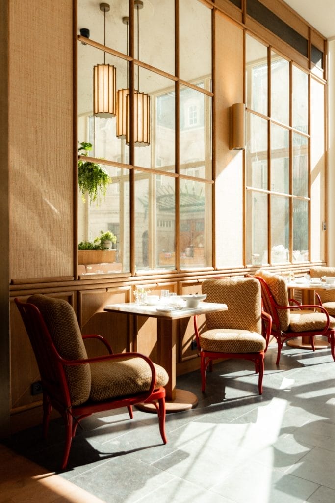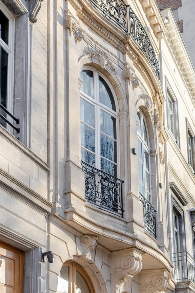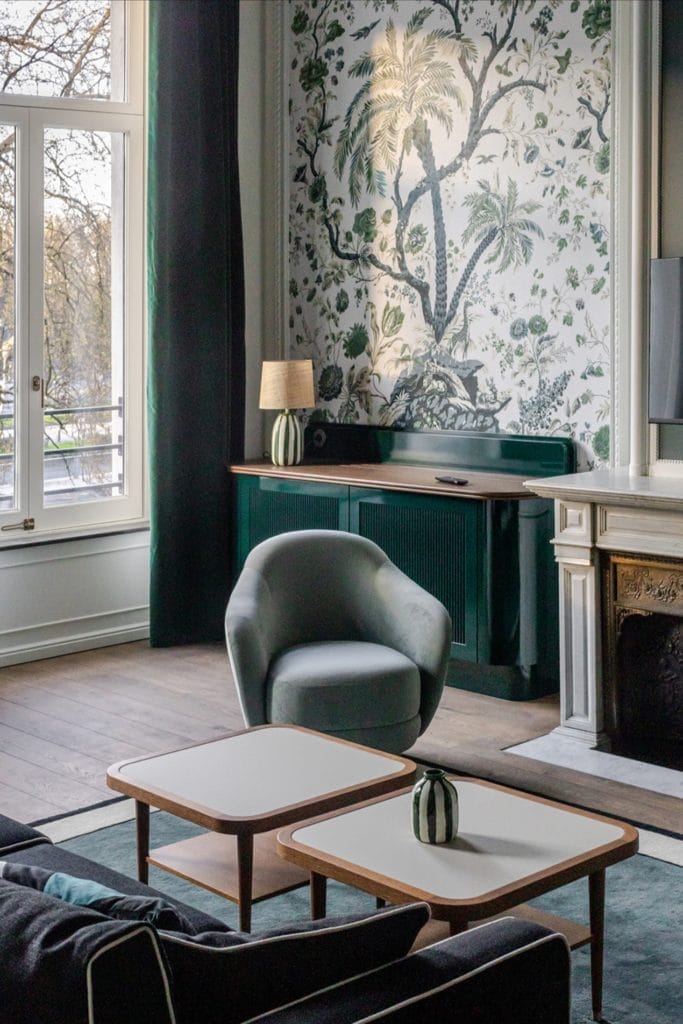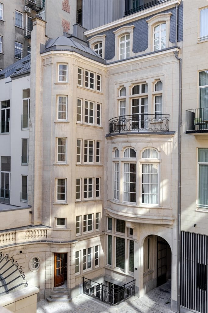 L’immeuble n°21, reconstruit en 1907 dans un style Louis XIV, a retrouvé tout son éclat grâce à des artisans belges spécialisés dans la conservation du patrimoine. Les façades, les moulures, les lambris et les parquets ont été restaurés à l’identique, tandis que le mobilier contemporain vient y insuffler une modernité douce.