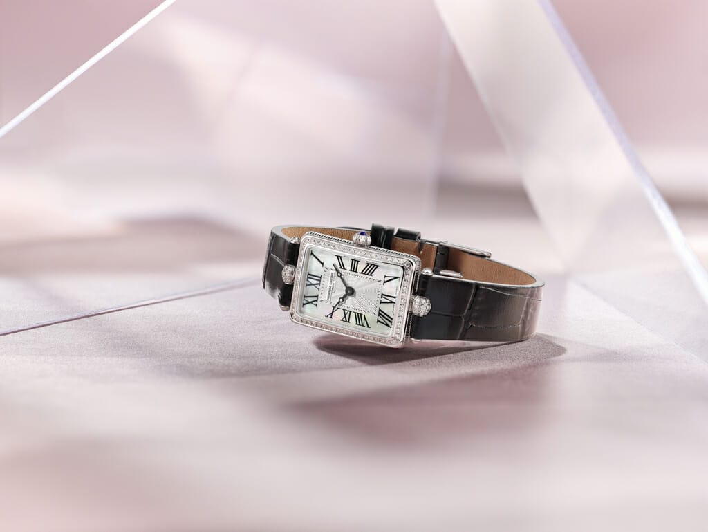 Lancée en 2005 par la manufacture horlogère suisse Frédérique Constant, la ligne Classics Art Déco dévoile, en 2022, une nouvelle silhouette à la géométrie carrée. Sa boîte s’affine pour atteindre de nouvelles proportions plus sveltes et précieuses. Mariant nacre naturelle et diamants, trois nouvelles références voient le jour. Toujours de facture très classique, guillochées et ornées d’un cabochon, ces montres féminines sont dessinées pour le quotidien.