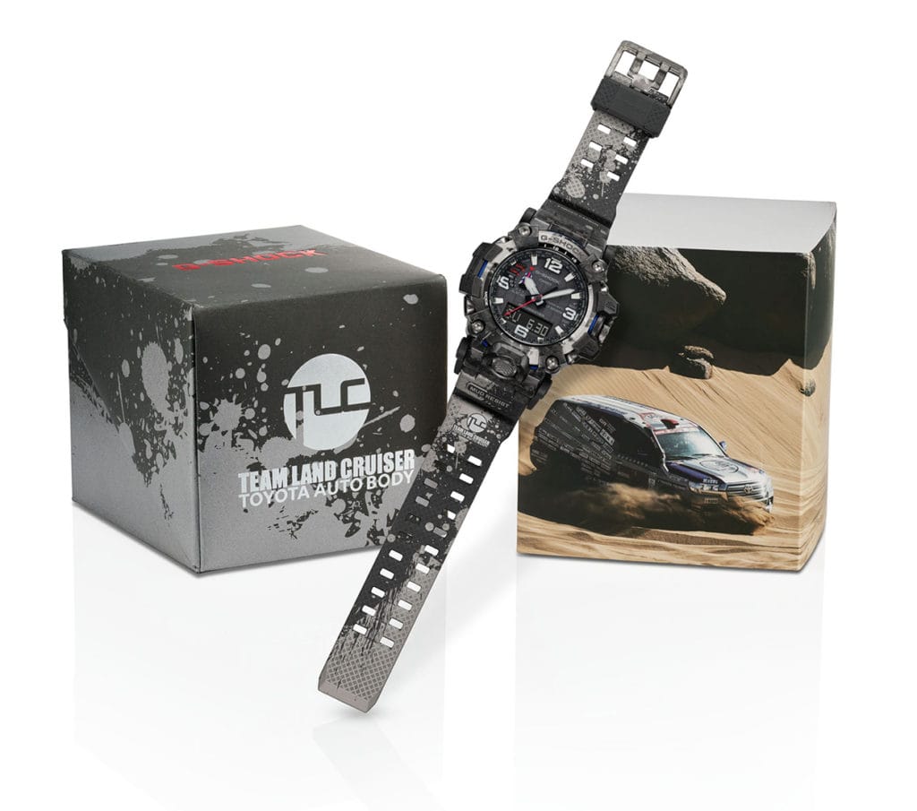 La GWG-2000TLC fait référence au Land Cruiser après avoir parcouru une journée intense dans le désert. Le bracelet présente un motif mélangeant éclaboussures de boue et de sable. La gravure au laser sur la lunette et la boucle en acier inoxydable ionisé noir accentue cet effet. On retrouve également des notes de bleu, blanc et rouge, couleurs de l’équipe ainsi que le logo sur le bracelet et au dos du boîtier qui rendent hommage à la robustesse de cet engin, toujours prêt à affronter les environnements les plus difficiles.