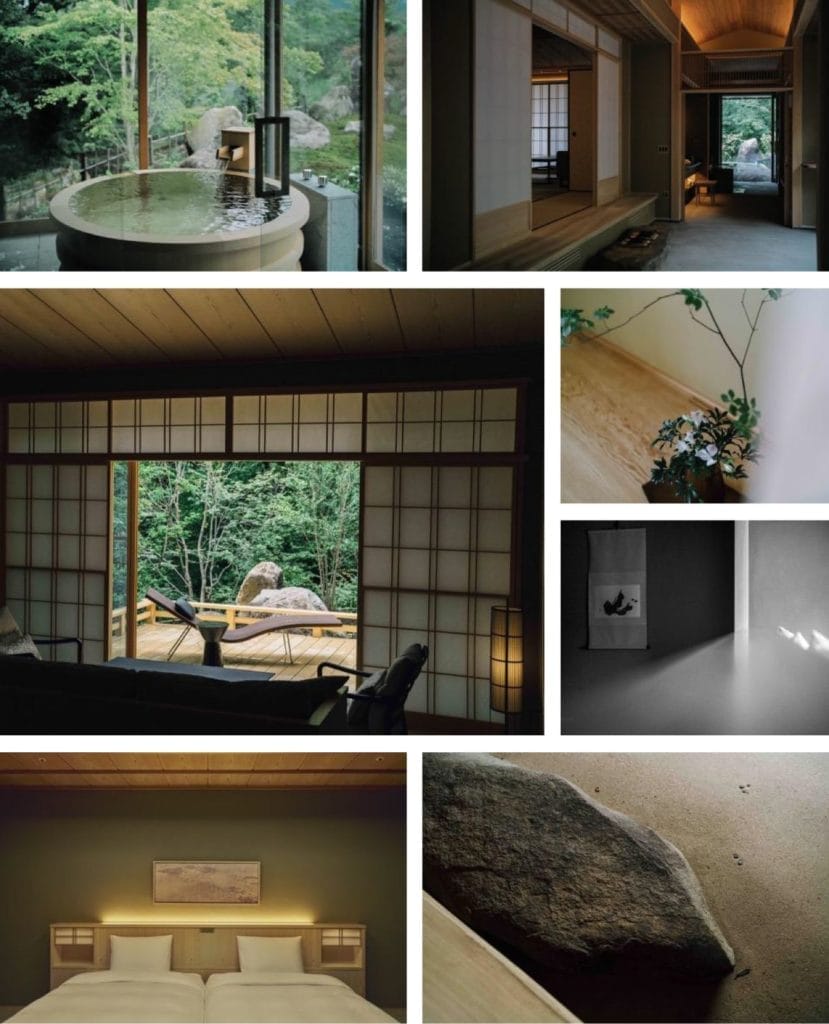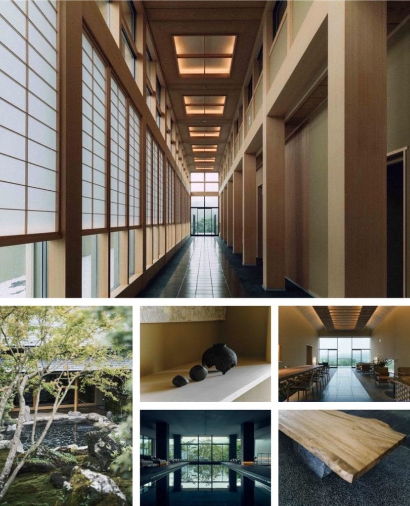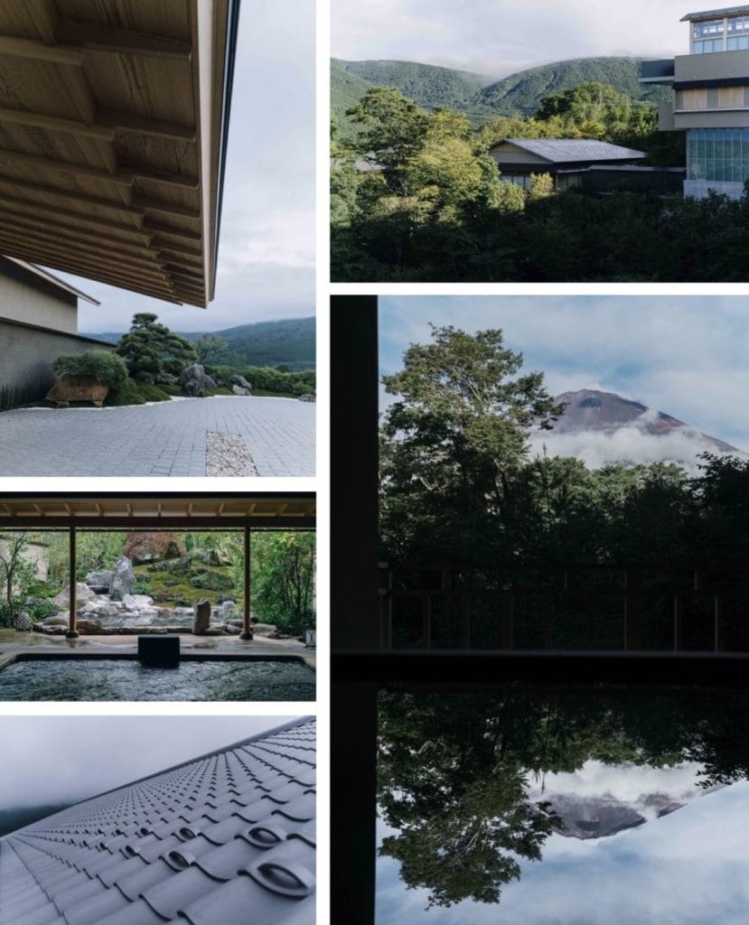 Signée du studio Ogitsu Architects et du bureau de design A.N.D., l’architecture du lieu rend hommage au Japon ancien tout en affirmant une esthétique contemporaine. Colonnes majestueuses, couloirs inspirés des résidences impériales, jardins évolutifs au gré des saisons : tout ici célèbre la beauté de l’instant. La terrasse suspendue Fujimi semble flotter au-dessus du paysage, invitant à la contemplation.