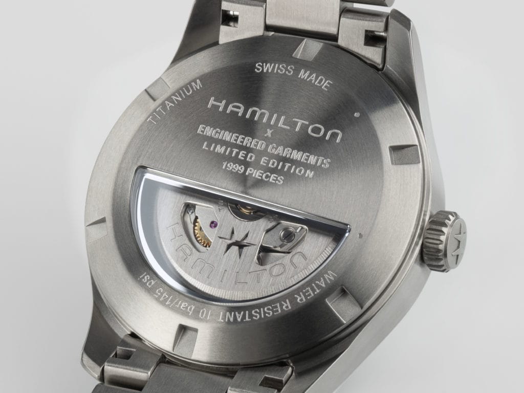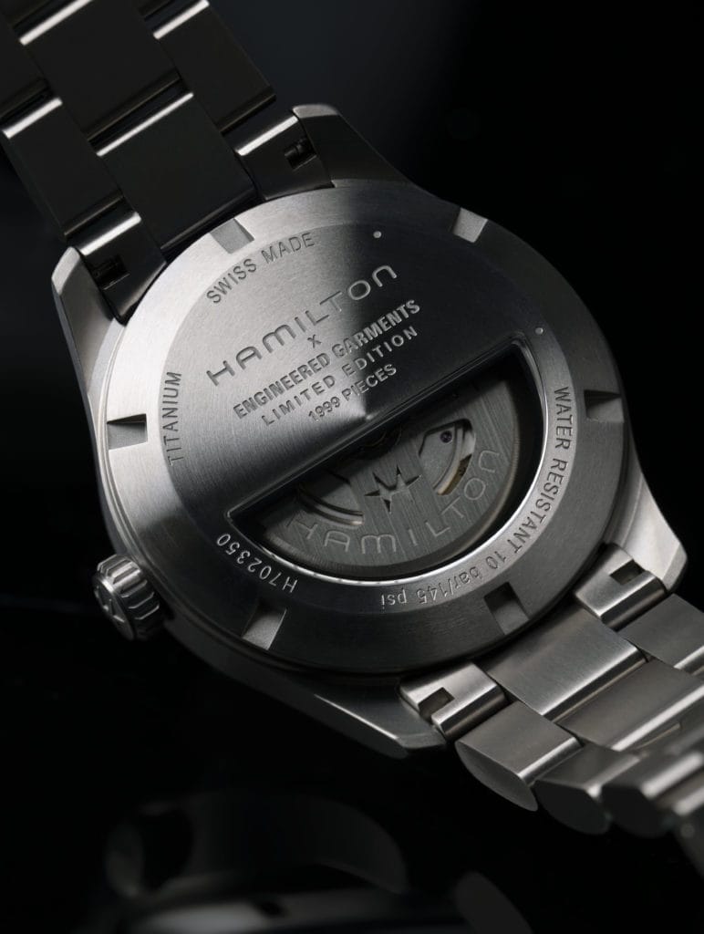La montre Khaki Field Titanium Engineered Garments est proposée au prix de 1080 CHF, 1225 EUR, ou 1145 USD, et sera disponible en édition limitée à 1999 exemplaires.