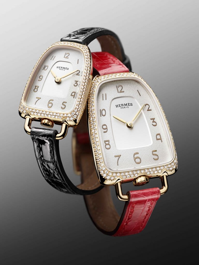 Étroitement liée au répertoire équestre de la maison, la Galop d’Hermès devient montrebijou, offrant sa silhouette en étrier à trois nouveaux Petits Modèles (20 x 27.2 mm) en acier non serti, en or rose ou acier sertis de 134 diamants. Son boîtier galbé aux angles adoucis accueille un cadran largement ouvert, rythmé par des chiffres arabes de tailles différentes. Agrandis sur la partie inférieure de l’affichage, ils expriment la notion de mouvement et de perspective.