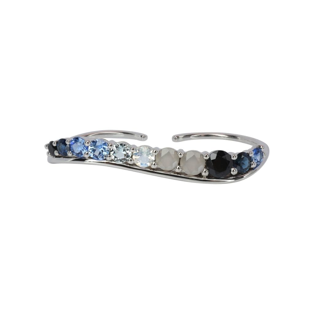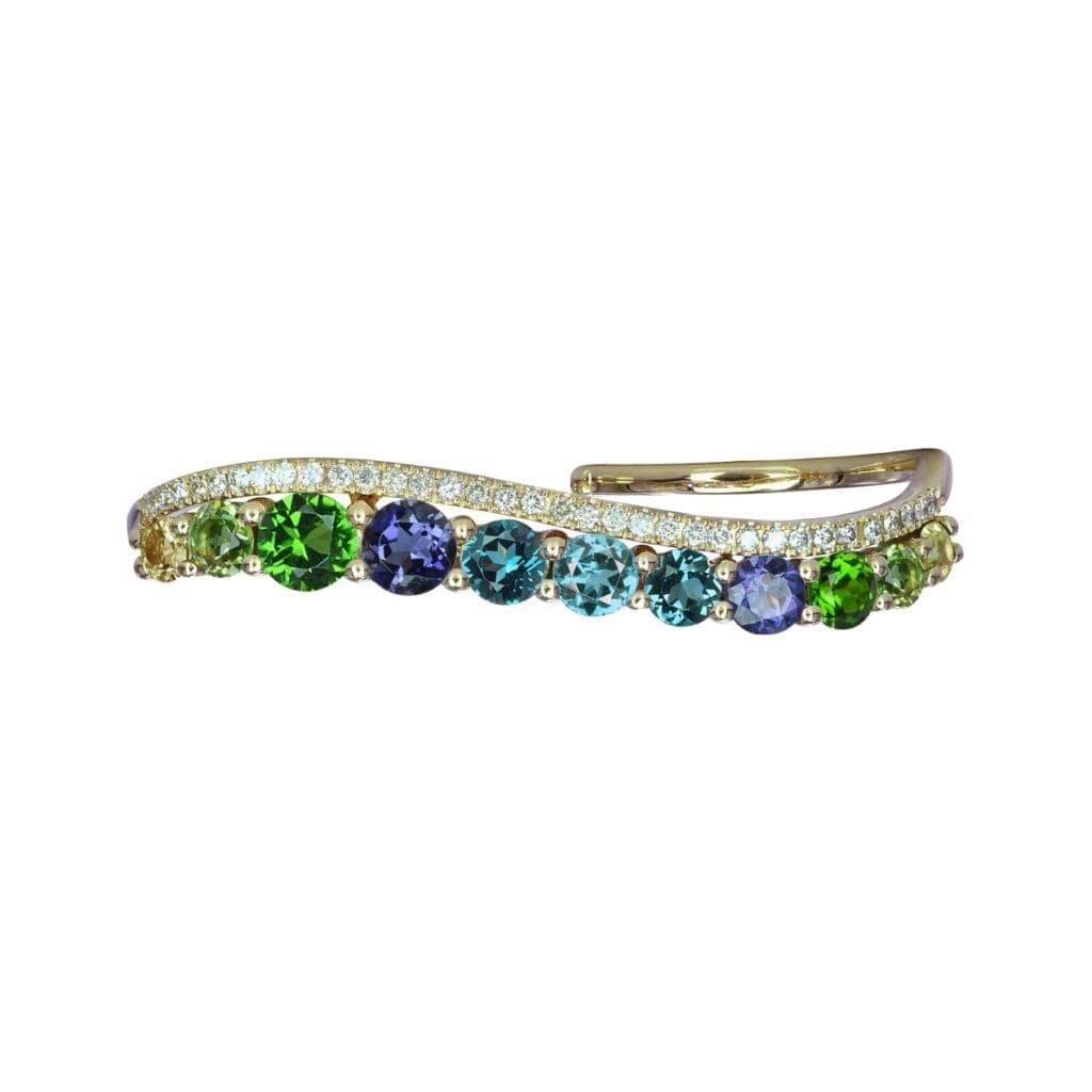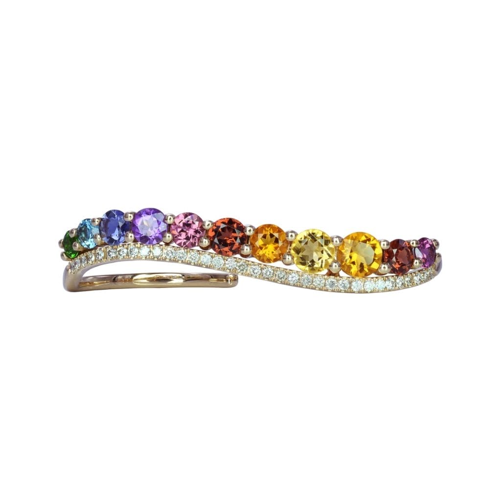 La bague deux doigts de la collection Ardèche est un véritable hommage à la nature, capturant la beauté des couchers de soleil sur les montagnes de l’Ardèche à travers une palette de couleurs éclatantes. Les gemmes, minutieusement sélectionnées et disposées sur un fin filament d’or, offrent un éclat incomparable, sublimé par des diamants délicatement sertis. La diversité des couleurs et des tailles des pierres crée un pavage harmonieux qui épouse parfaitement la main, créant ainsi un effet visuel saisissant, surtout lorsque porté en duo ou en trio.
