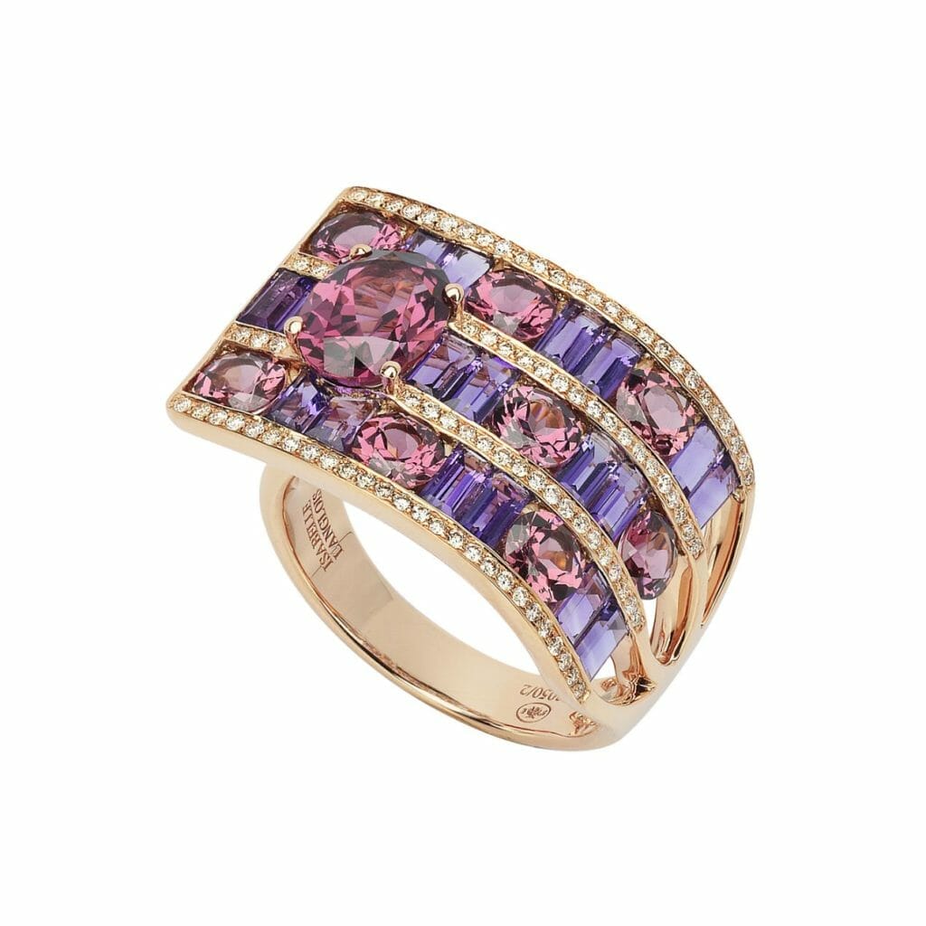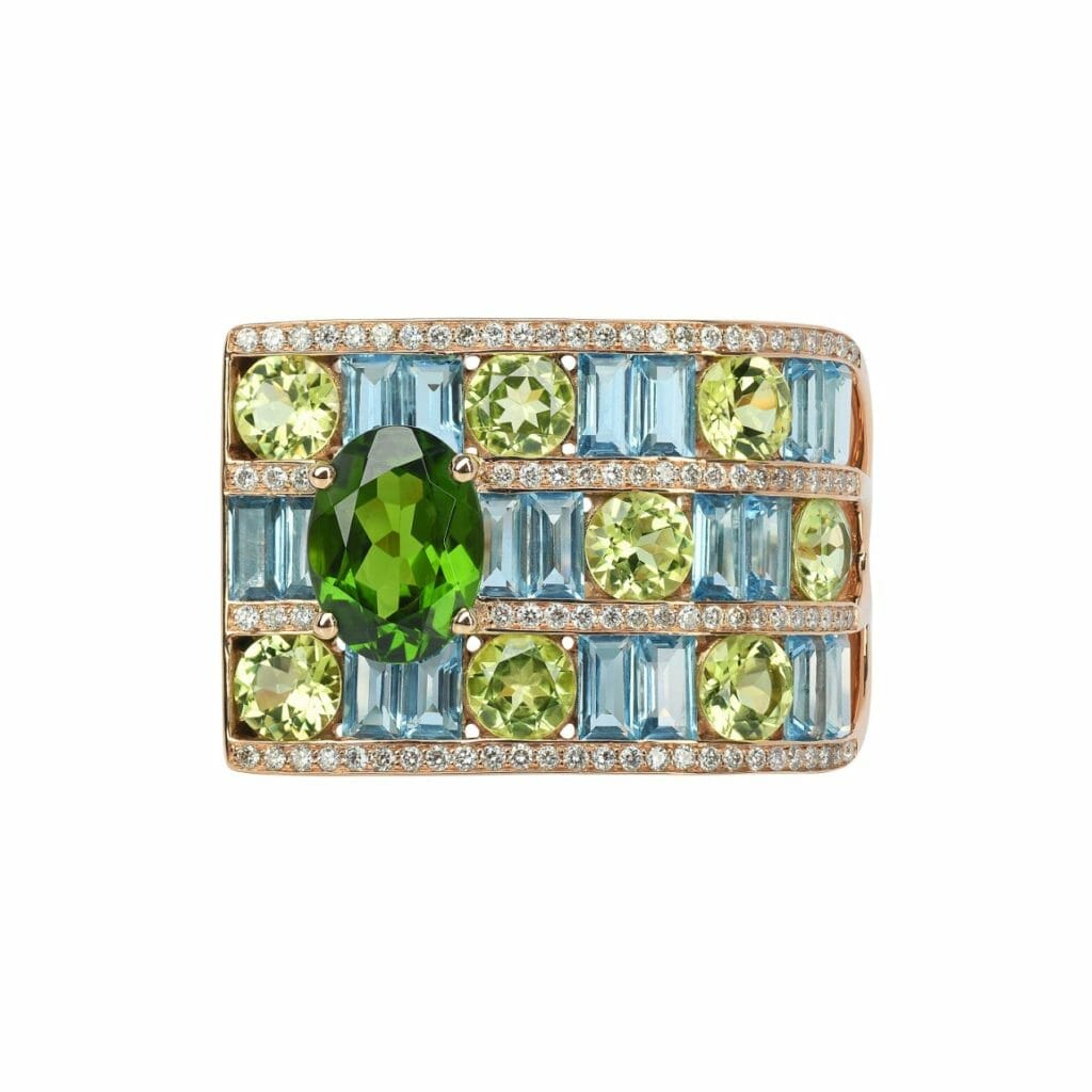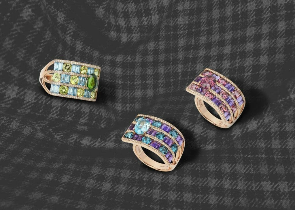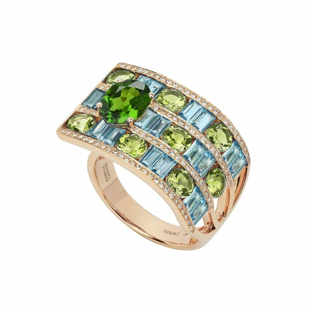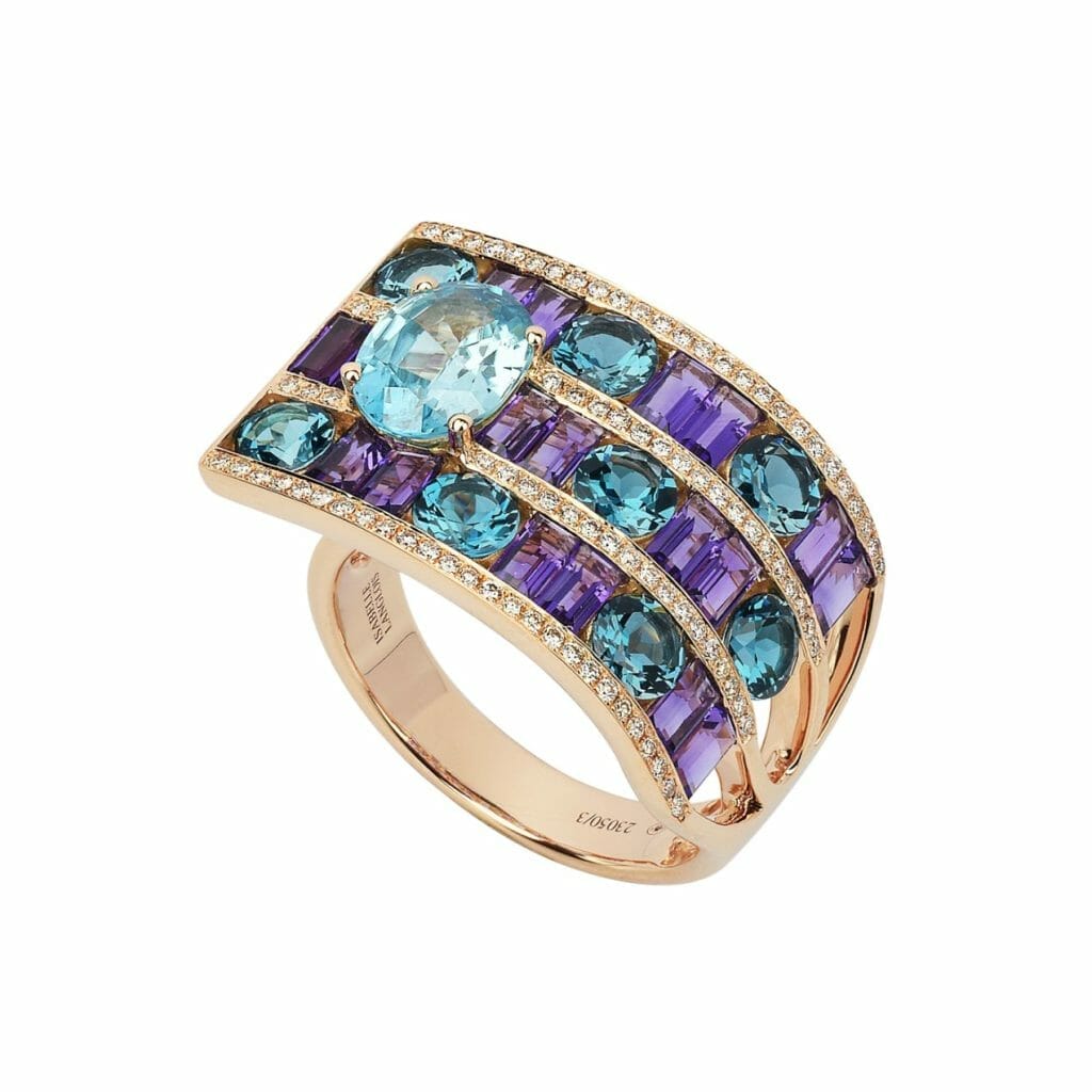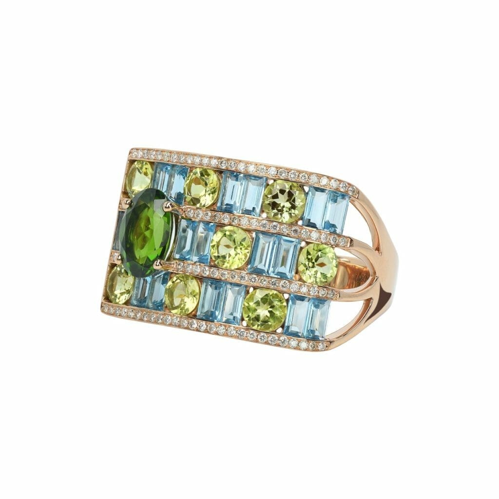 A l’image d’un tissage entrelaçant des fils à angles droits, les gemmes de couleur sont tressées sur trois rangs, harmonieusement alignées dans un jeu de tons contrastants et de formes à géométrie variable. Bordées de fines lignes de diamants pour sublimer leurs éclats chatoyants, l’ensemble est ponctué d’une belle pierre facettée, se singularisant par sa taille ovale. Délicate alchimie entre l’ingéniosité du lapidaire et le savoir-faire traditionnel de la joaillerie française, cette bague d’un beau volume rivalise de charme par son allure graphique.