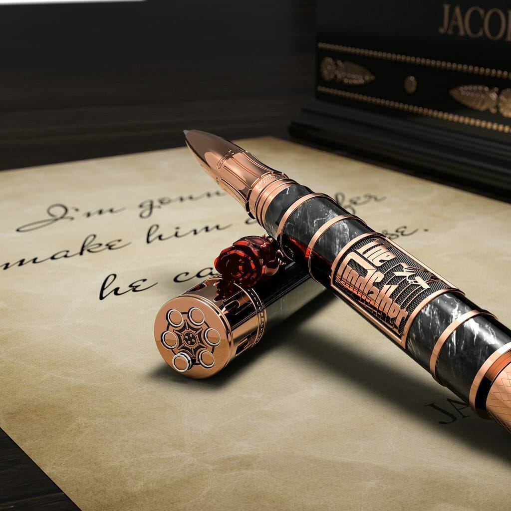Limité à seulement 499 pièces, le stylo plume et le roller font suite à The Opera Godfather Musical Watch, qui combine le monde de l’horlogerie ultra-haut de gamme avec le romantisme et la complexité époustouflants d’une comédie musicale mécanique – un vibrant hommage au Parrain comme un chef-d’œuvre du cinéma et au dévouement de Jacob & Co. à l’excellence.