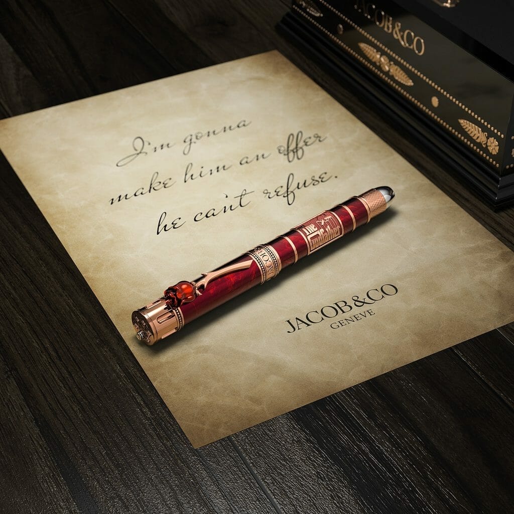 La collection de stylos en hommage au film Le Parrain est un nouvel opus canalisant l’inspiration du film de Francis Ford Coppola et la marque Jacob & Co. La collection se compose d’un stylo plume en celluloïd rouge avec une plume en or rose 18 carats et d’un stylo roller noir. Les deux sont logés dans un boîtier noir dédié avec une couverture en cuir rouge, des charnières dorées et des impressions tout autour.