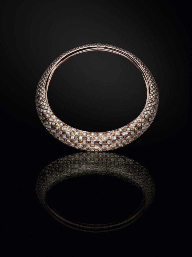 Le chapitre se poursuit avec « Plants », illustrant l’épanouissement de la vie avec des créations verdoyantes, et « Fossils », qui témoigne des bouleversements passés à travers des vestiges minéralisés. « Skin », un thème inédit, se pare de saphirs Umba aux tonalités rose-orangé, créant des compositions modernes et graphiques en or rose.