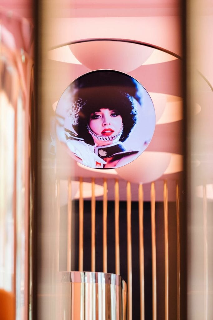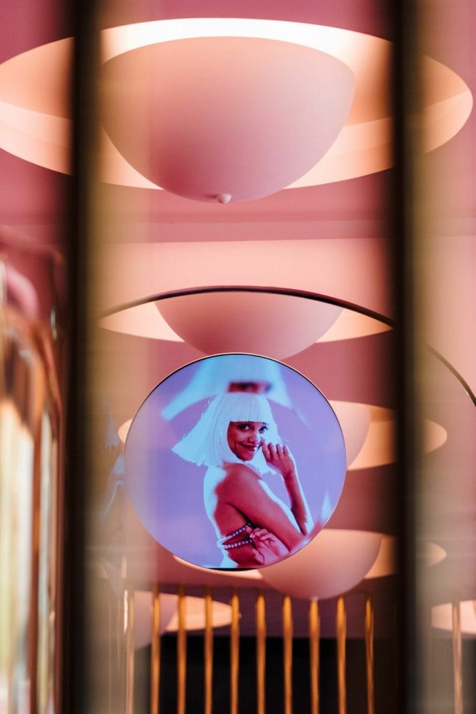 Cette orientation artistique se remarque dans le moindre détail : plus de rondeur dans les lignes du mobilier, dans les alcôves, dans les détails architecturaux. Plus de douceur dans la peinture murale rose tendre. Plus d’esprit également dans les courbes des mini banquettes en forme de bouche, inspirées par la fameuse silhouette du canapé Bocca de Salvador Dali, qui s’est lui-même inspiré de la bouche de la star américaine des années trente, Mae West. Ce fameux « canapé-bouche » est d’ailleurs mis à l’honneur dans deux tableaux du Crazy Horse : La Leçon d’Erotisme et Striptease-Moi, le premier datant des années 80 et l’autre de 2016.