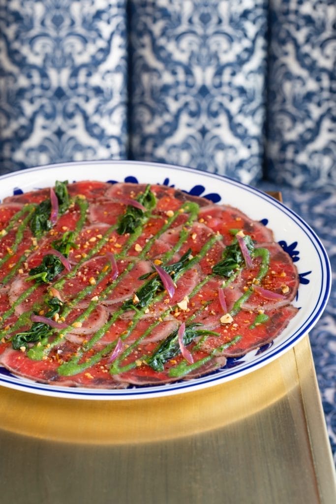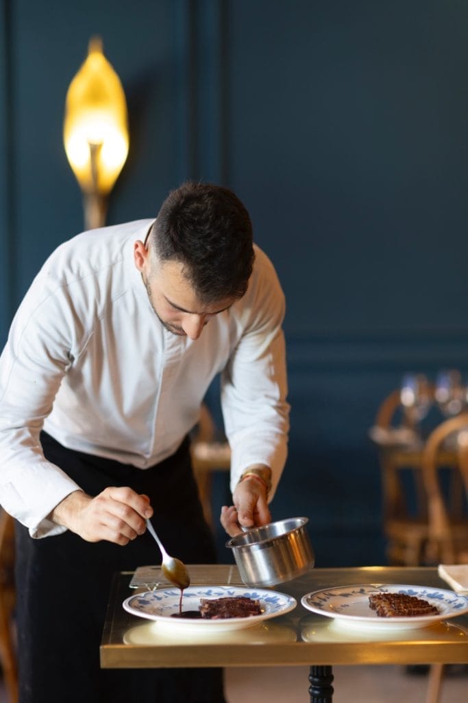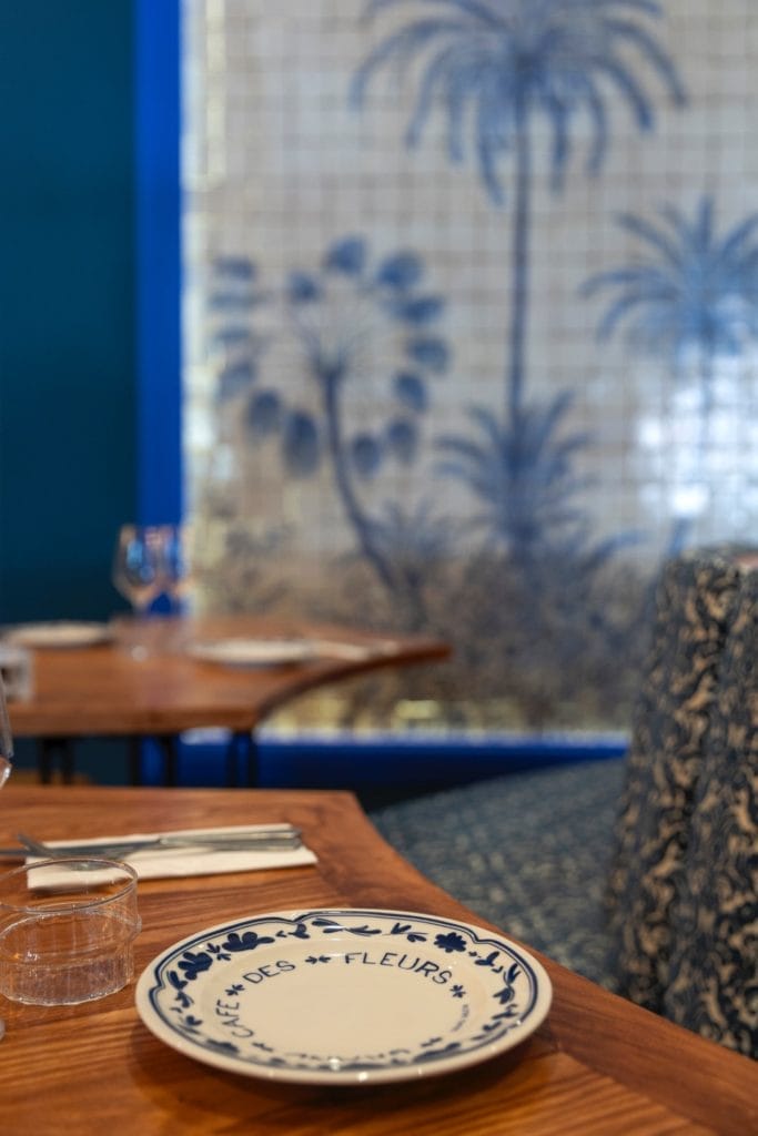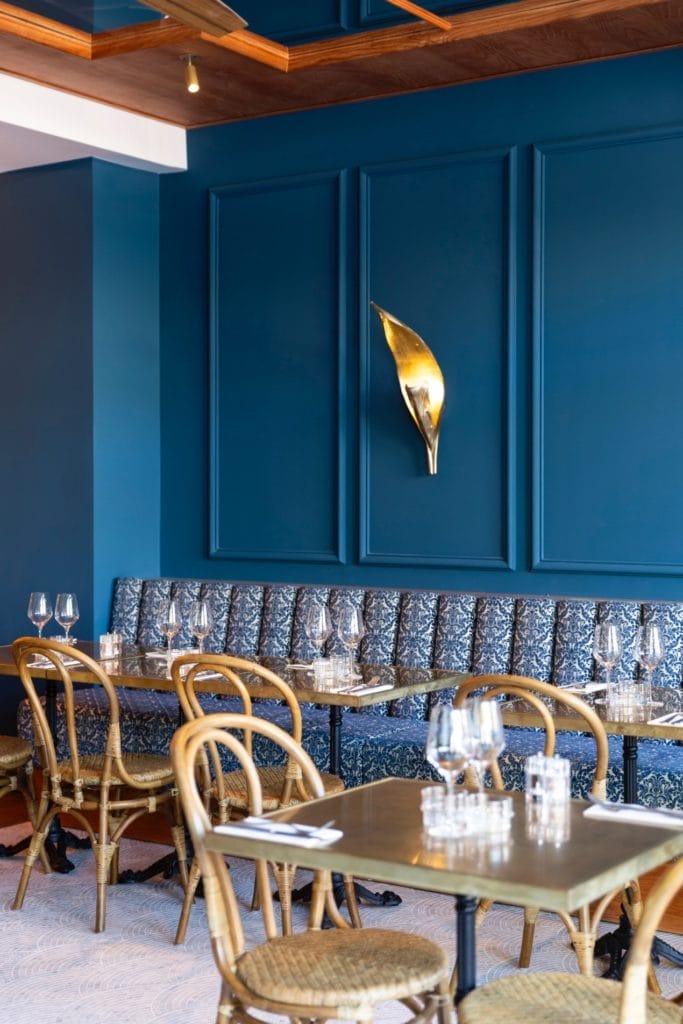 Pensée par Studio Pano, la décoration intérieure revisite l’esprit Belle Époque dans une palette inspirée de la mer : bleus Klein, marine ou paon, mosaïques crèmes, laiton patiné et grandes arcades en bois rappelant les bouquets du marché voisin. La cuisine ouverte, au centre du restaurant, vibre au rythme des services orchestrés par le chef Imer Isejni, passé par le Louis XV d’Alain Ducasse, épaulé par Vincenzo Pezzella et Jeanne Cohen.