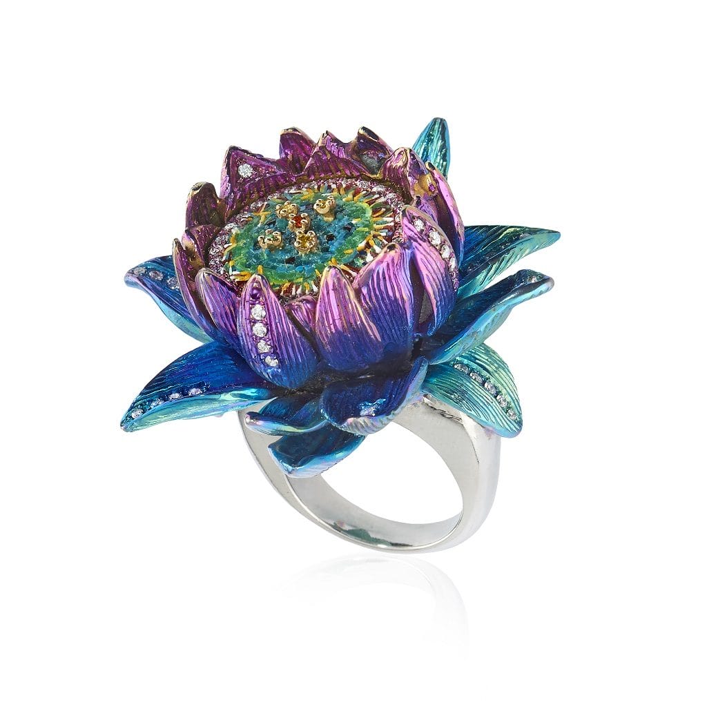 Au cours du processus de fabrication, le titane est oxydé et passe ainsi du blanc aux teintes de vert, bleu sarcelle, bleu pétrole, et se transforme enfin en un fuchsia intense, violet et indigo. Le métal est connu pour sa durabilité, mais en combinaison avec ces couleurs vibrantes, il place la beauté et la féminité de la bague en lieu de pouvoir. La juxtaposition entre féminité délicate et force métallique met en évidence l’émancipation des femmes et le pouvoir de la féminité.