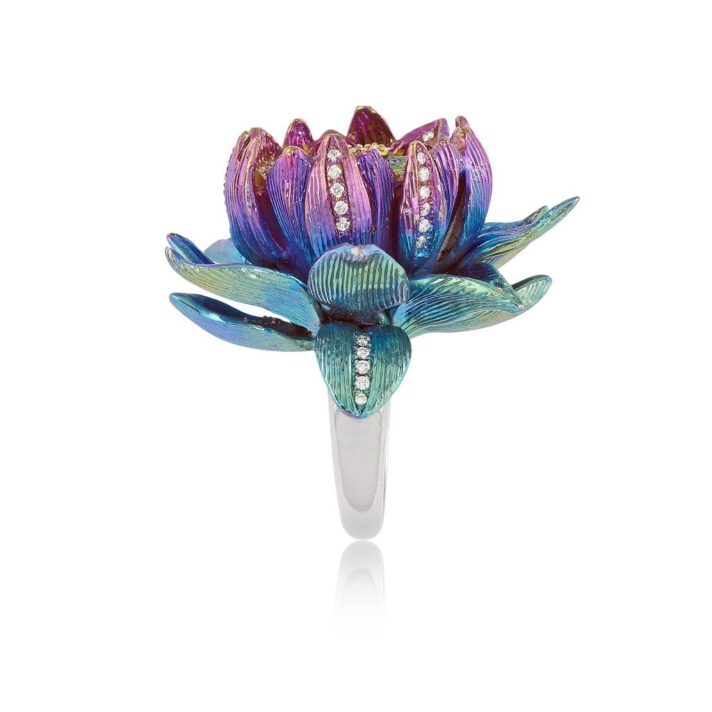 La fleur de lotus est également connue pour son parfum enivrant. Grâce à l’aspect sensuel et élégant de la fleur, le lotus symbolise la féminité et la beauté, et le dégradé multicolore sur les pétales de la bague projette véritablement cette beauté.
