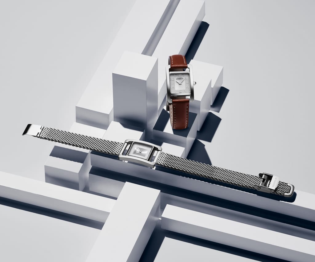 Paré d’un carré inséré subtilement dans un rectangle ajouré, le boîtier en acier inoxydable est l’atout charme de cette montre. Définissant une vision du temps à géométrie variable, il dévoile un précieux cadran dont le centre brossé soleillé souligne des chiffres arabes, tout en rondeur sensuelle.
