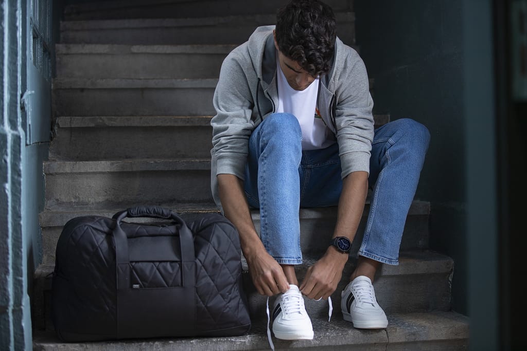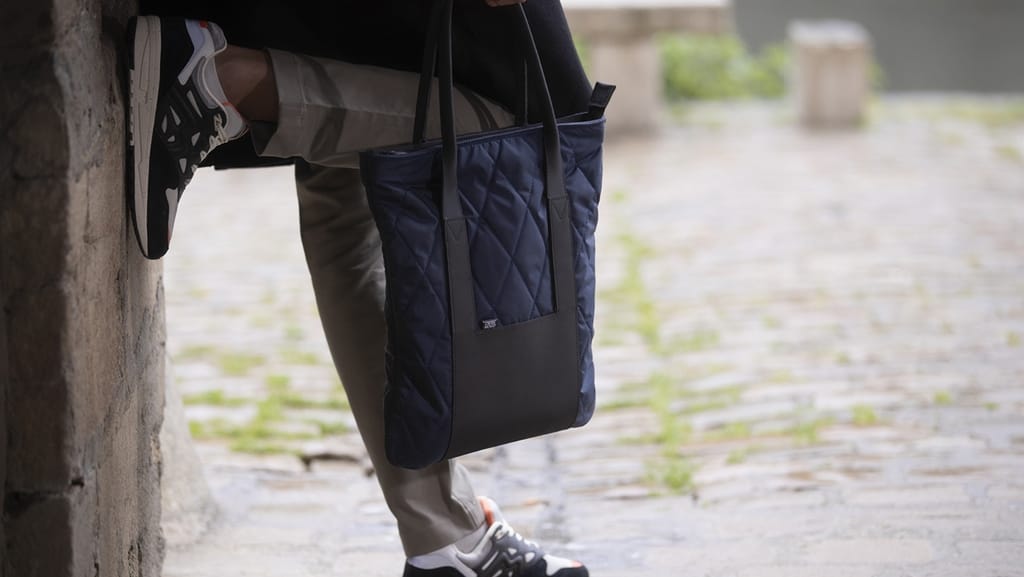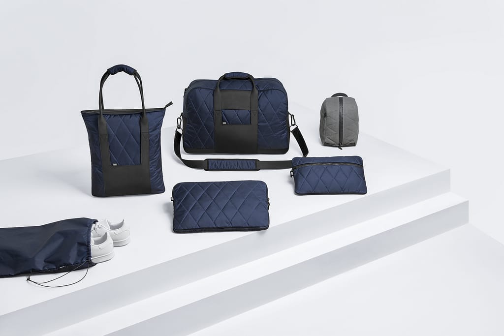 L’air est leur source d’inspiration pour ce premier voyage. S’il y a une matière pour illustrer leur démarche créative, c’est la toile de montgolfière : fine, légère, poétique et très résistante. La toile aérienne a été doublée avec un textile ajouré épais et structurant, le fil de couture devenant le liant entre ces deux matières. Le matelassé lui confère un aspect gonflant particulier, qui fait référence au ballon de montgolfière chauffé à l’hélium. Comme si le produit n’avait pas oublié sa vie passée.