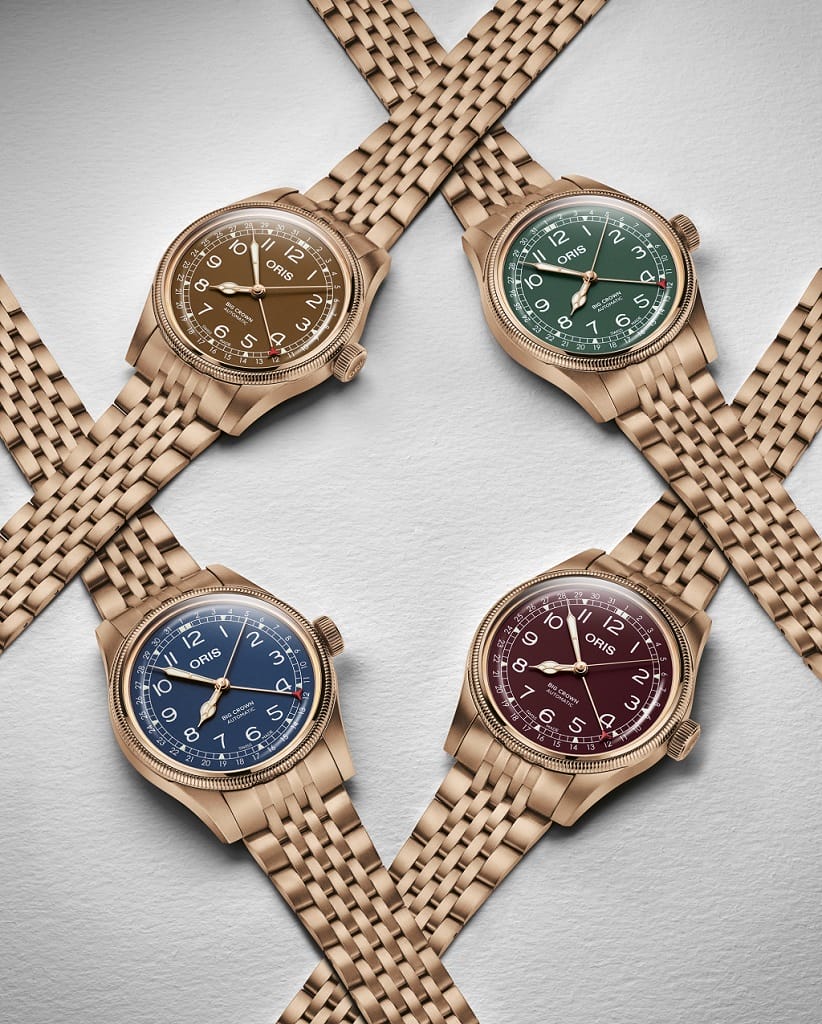 Produite en continu depuis 1938, la Big Crown Pointer Date est le modèle le plus ancien de la maison Oris, mais elle est également devenue une icône de l’horlogerie suisse. Avec sa couronne surdimensionnée, son aiguille pointer date en forme de croissant rouge et sa lunette cannelée, elle est la montre signature d’Oris et un synonyme de design horloger intemporel. Aujourd’hui et pour la première fois, la maison Oris l’habille intégralement de bronze (boîtier, lunette, couronne, bracelet et boucle en bronze massif) et propose quatre déclinaisons de couleur de cadran : vert, brun, bordeaux et bleu.