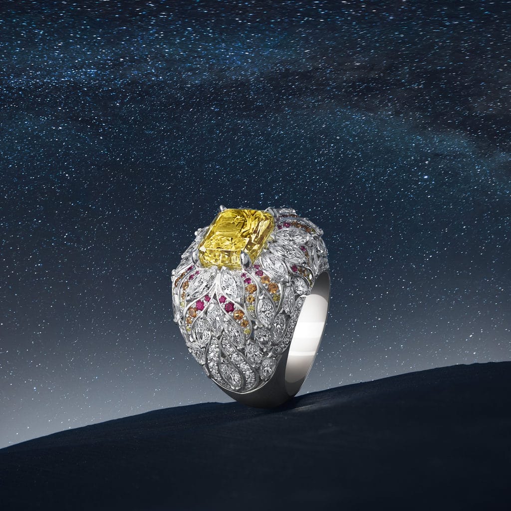 Cette association de couleurs se retrouve comme un écho dans les boucles d’oreilles de la parure. La bague assortie ajoute quant à elle une note esthétique magistrale avec son diamant central taille coussin de 5,54 carats dans une couleur jaune Fancy Vivid. Celui-ci brille de l’intérieur et irradie dans toutes les directions, brûlant d’une intensité aussi vive que le soleil. Un diamant sur 10 000 est classé comme Fancy. Parmi ces pierres, seuls 6 % des jaunes sont reconnus Fancy Vivid, le degré le plus élevé en termes de puissance de couleur.