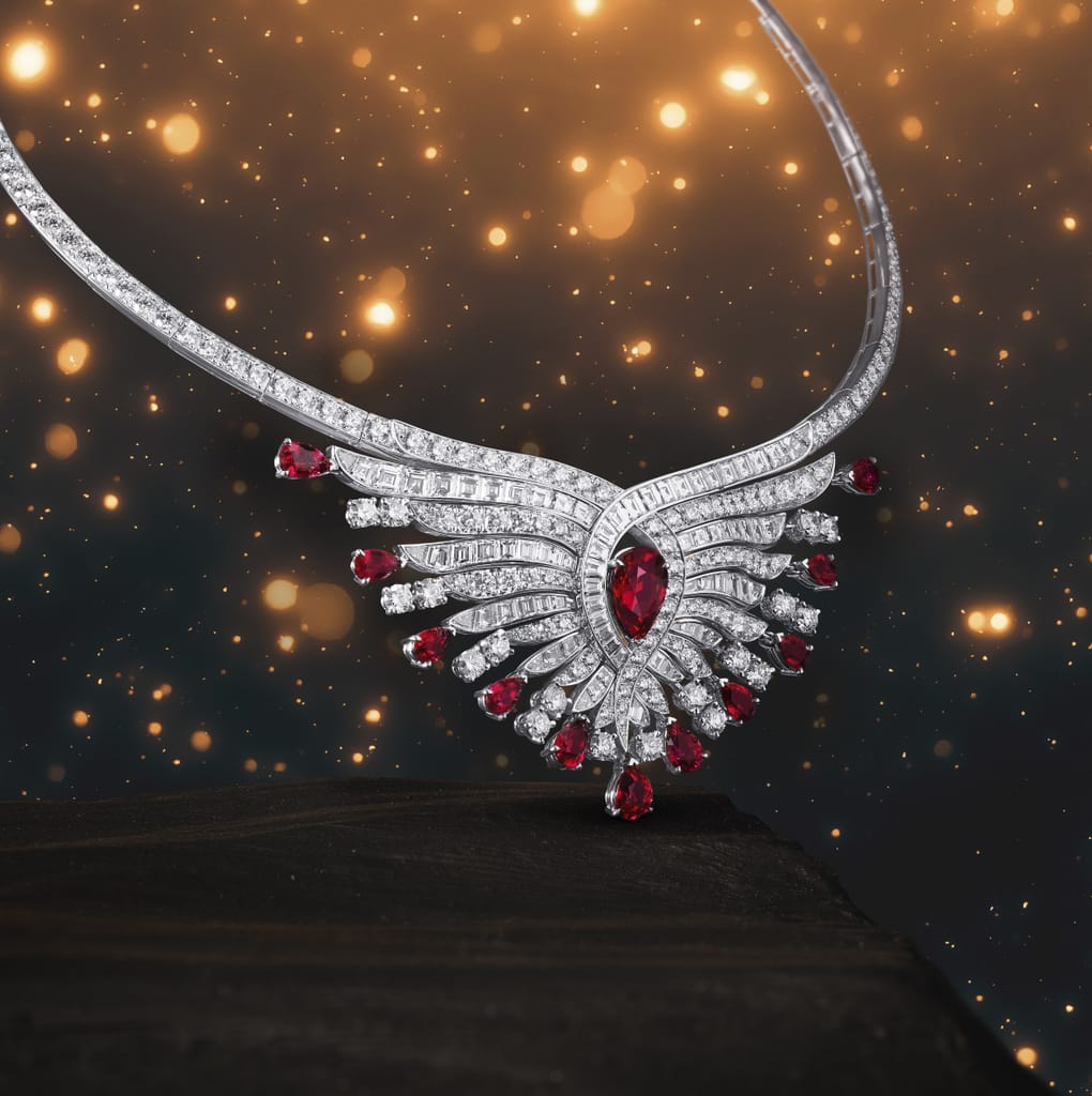 Le collier Blazing Night arbore 12 magnifiques rubis provenant du Mozambique et de la Thaïlande. Serties à l’image d’une étoile rayonnante, les pierres présentent une taille poire rappelant l’arc grâcieux formé par les lanternes s’élevant vers le ciel, ainsi que des teintes vives de rouge exprimant la passion de la foule. Le design rayonnant du collier est développé encore davantage à travers la montre manchette, parfait exemple du savoir-faire triomphant de Piaget en matière de fonctionnalité, mais aussi d’esthétique. Comprenant également une bague et un bijou d’oreille asymétrique, les créations de la parure Blazing Night sont des pièces uniques, fruit d’un véritable travail de virtuose.