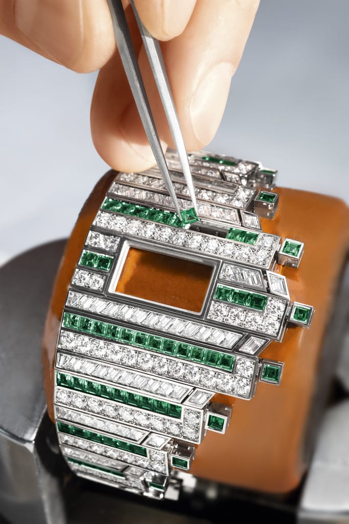 Le cadran parfaitement intégré de la montre Magical Aurora est orné d’une collection unique d’émeraudes taille baguette originaires de Zambie.