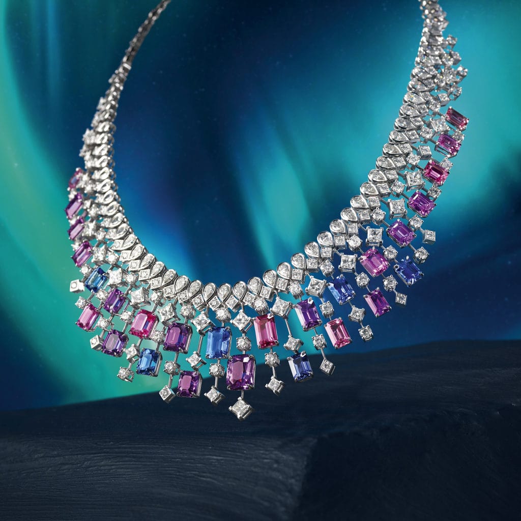 Déclinée dans presque toutes les nuances imaginables, la famille des saphirs propose l’une des palettes de couleurs les plus larges dans l’univers des pierres précieuses. La cascade de 27 saphirs ornant ce collier offre une collection unique de nuances naturelles.