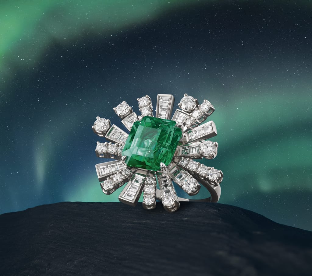 Le processus de formation en deux phases propre à l’émeraude génère toujours une tension à l’intérieur du cristal en développement et engendre des inclusions et une pureté moindre, ce qui fait de cette grande pierre à la couleur intense et à la transparence parfaite un spécimen d’une rareté encore plus grande. Les conditions de développement les plus adaptées nécessitent la bénédiction de la nature, mais l’expertise technique du lapidaire en charge de transformer la matière brute en une pierre et le sertissage revêtent la même importance. En raison de cette fragilité inhérente, seul un maître artisan – et dans ce cas précis, une personne jouissant de plus de 15 ans d’expérience – dispose des compétences nécessaires pour sertir parfaitement la pierre sans l’endommager. Affichant une taille carrée aux proportions parfaites, cette émeraude est la définition même de la pierre précieuse. Fortes des caractéristiques uniques liées à leur provenance, les émeraudes centrales ornant la bague et les boucles d’oreilles forment un ensemble de pierres qui aura nécessité plusieurs années de recherche. Leurs explosions magiques de teintes verdoyantes constituent le pendant parfait aux couleurs offertes par la nature au-dessus de nos têtes.