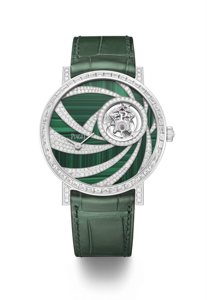 La montre Dancing Aurora en édition limitée présente un calibre extra-plat avec un mouvement tourbillon et une cage, des prouesses techniques signature de la Maison Piaget, dont l’esprit novateur a permis à ses artisans de mettre au point les premiers modèles extra-plats dans les années 1960. Le défi suivant était la création d’un cadran à la hauteur d’un tel luxe et depuis 1964, le recours à la marqueterie de pierres dures, un Métier d’Art nécessitant la plus grande minutie, s’est avéré produire des résultats exceptionnels. Sur ce modèle, des diamants blancs sertis semblent balayés par le vent, tourbillonnant et ondulant sur un fond serti d’une marqueterie de malachite à toute petite échelle. Mettant au défi le talent des plus grands maîtres artisans, chaque plaque de pierre dure est spécifiquement coupée en une tranche mesurant à peine un millimètre d’épaisseur et parfaitement sertie dans sa position exacte.