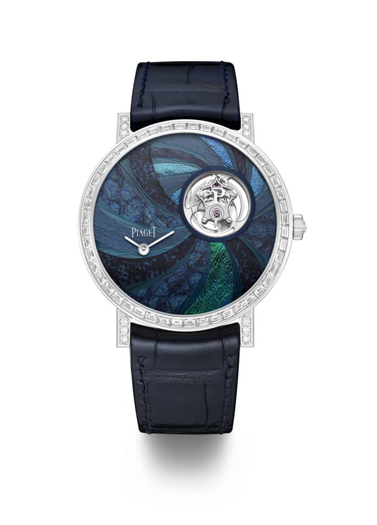 Spécialité de Rose Saneuil, cette micromarqueterie multi-matières requiert la plus grande patience et dextérité. À l’aide d’une technique « élément par élément », chaque pièce de matière est coupée individuellement selon le design initial, puis délicatement placée et sécurisée grâce à un microscope, en raison de l’échelle infiniment petite d’un tel travail. Pour finir, le cadran est illuminé de diamants sertis autour de la lunette et d’un autre détail signature de la Maison, le compteur heures-minutes décentré et le tourbillon volant du mouvement Piaget extra-plat 670P.