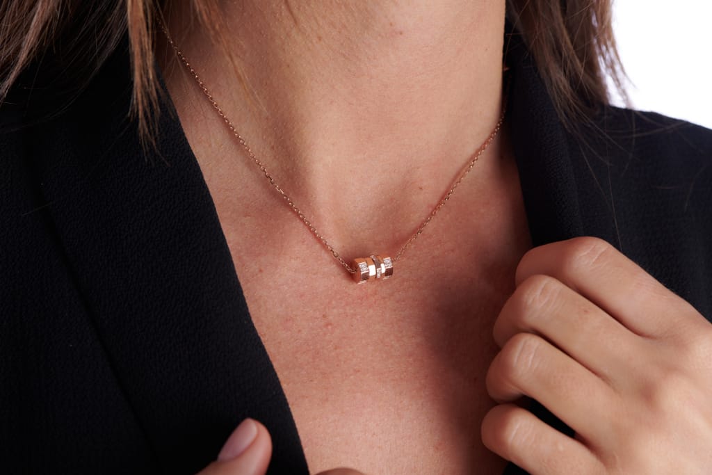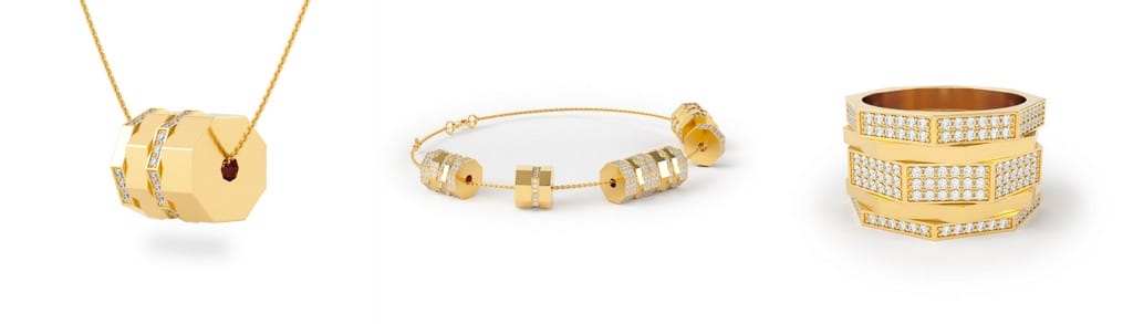 Enfilés sur une chaîne courte à maillons carrés arrondis très contemporains, trois, six, neuf modules d’or jaune, rose ou blanc autorisent toutes les combinaisons, entre surfaces polies et sections pavées de diamants. Ces jeux de contrastes animent aussi les bagues aux anneaux géométrisés de largeurs différentes, pouvant alterner demi ou full pavé, à « stacker » en deux, quatre ou six rangs.