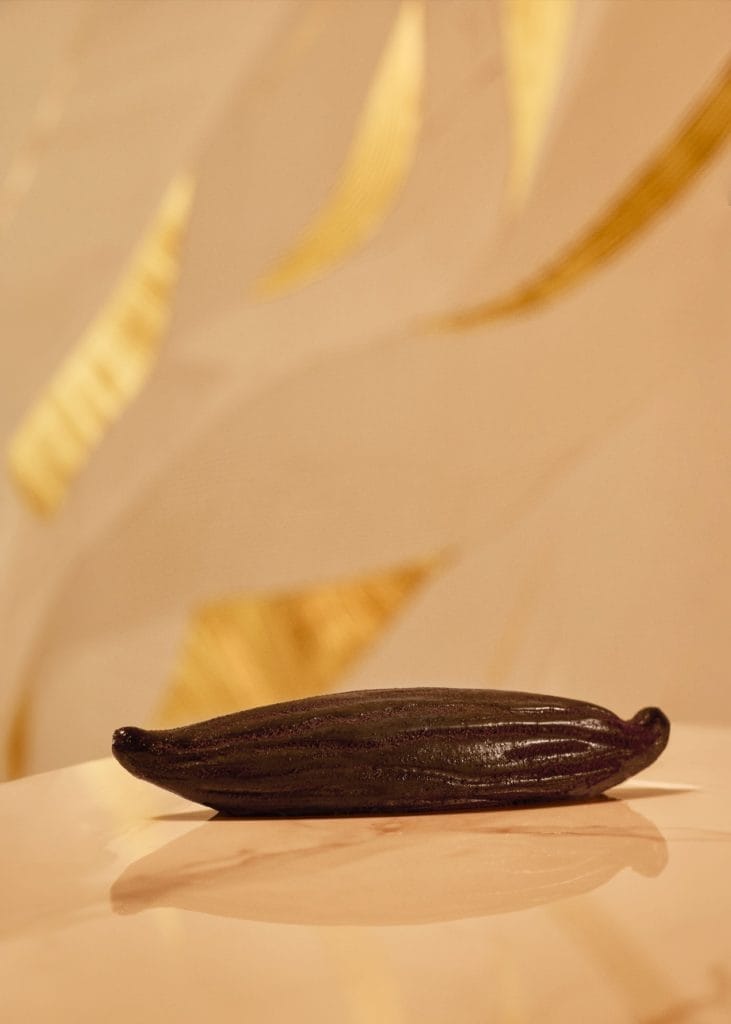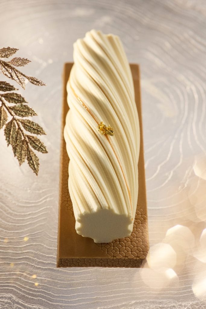 • La création d’Eric Frechon : hommage à la vanille de Madagascar sous forme de gousse. L’intérieur réunit génoise aérienne, praliné amande vanillé, mascarpone vanille grillée et confit de vanille rôtie.