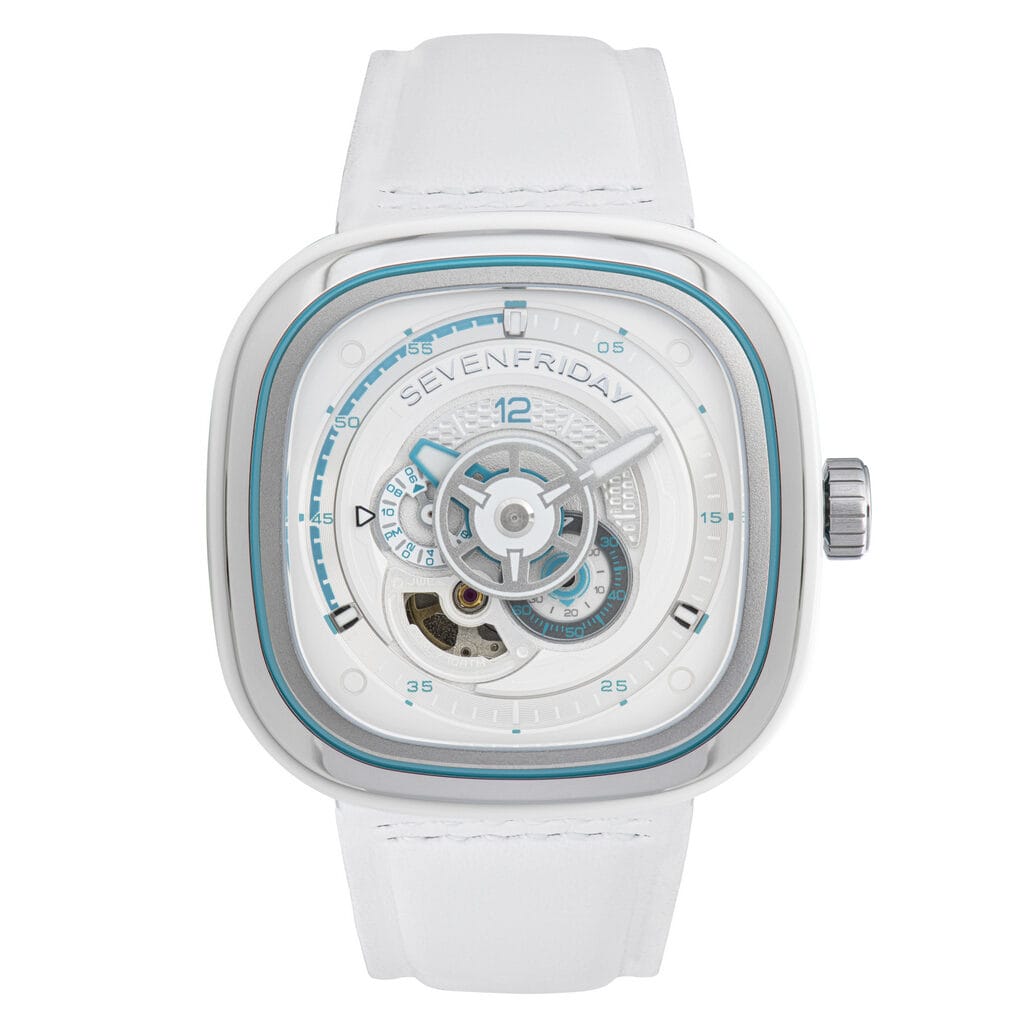 Rattachée à la série P, qui fut la première collection lancée par SEVENFRIDAY en 2012, la Beach Club revisite un classique de la marque. Inspirée par les machines industrielles, la série P a été la première à briser les règles avec son boîtier coussin et son cadran multicouche. La Beach Club, qui possède toutes les caractéristiques cette collection désormais iconique, est immédiatement identifiable.