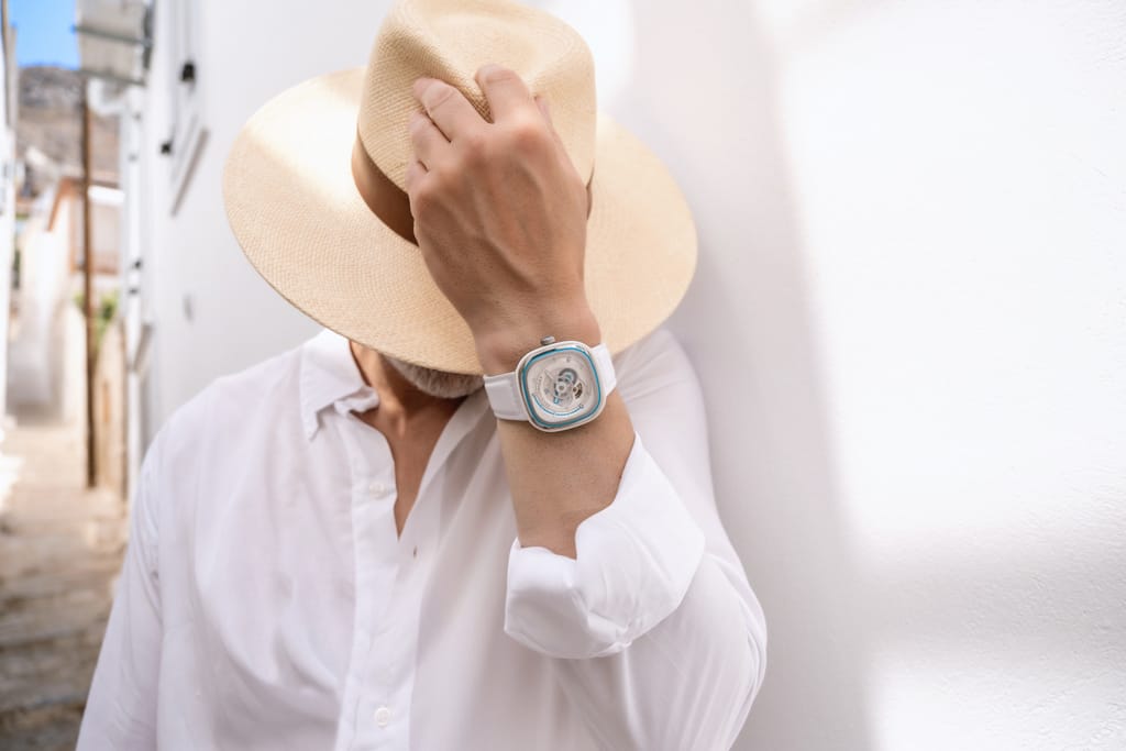 Ce nouveau modèle SEVENFRIDAY arrive juste à temps pour l’été. La Beach Club évoque l’atmosphère estivale des îles grecques. Grâce aux couleurs et aux matériaux spécialement choisis pour elle, la Beach Club est aussi fraîche et légère que la brise marine.