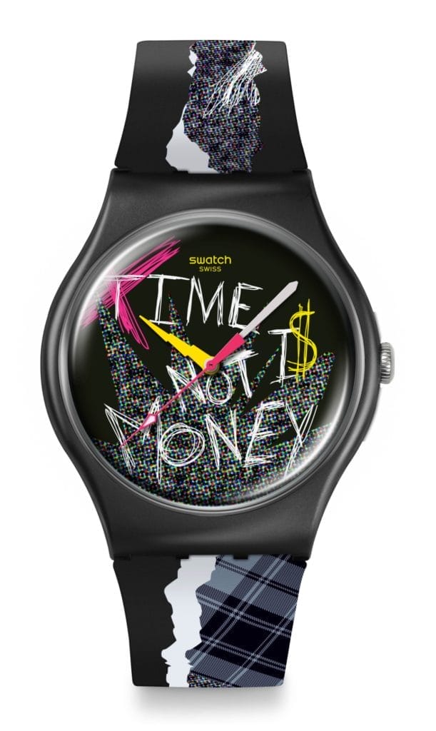 Sans doute le plus grunge des cinq. Un patchwork visuel mêlant tartan, graffiti et effets papier déchiré. Cette montre est équipée de SwatchPAY!, une technologie de paiement sans contact qui prouve que la provocation peut aussi rimer avec innovation. - PIERCED EDGE (110 € – modèle What If?)