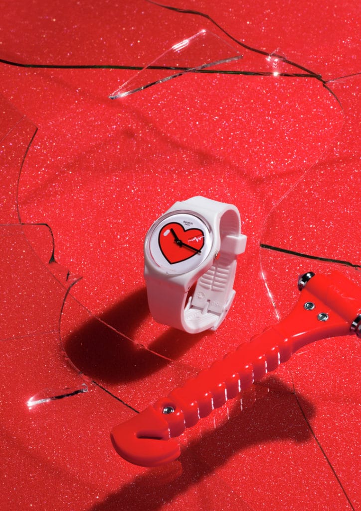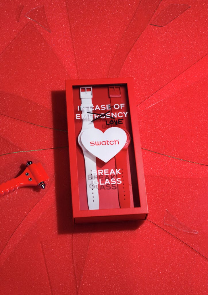 Le boîtier, le verre et la boucle des deux montres sont en matériaux biosourcés. Swatch ajoute une touche ludique avec des cœurs fluorescents sur leur cadran et l’inscription « In case of love, open the box » (Si l’amour frappe, ouvrez la boîte) sur l’emballage.