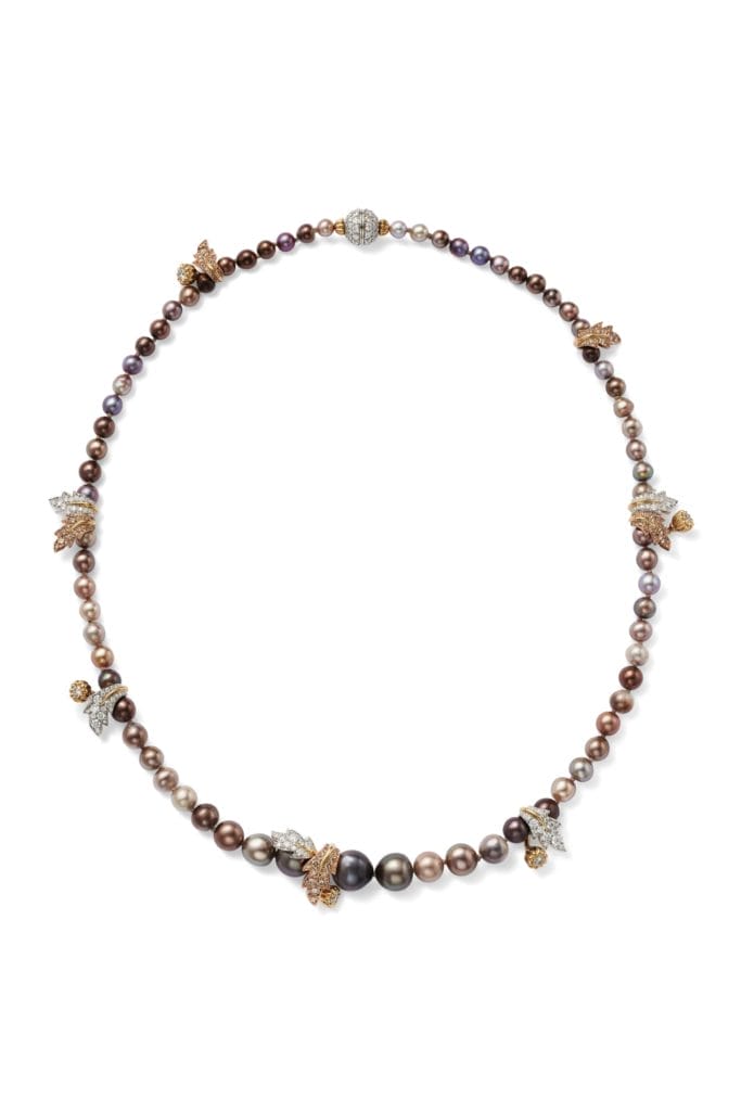 Acorn & Oak Leaf – Le motif du gland et de la feuille de chêne, cher à Jean Schlumberger, se décline sur des colliers et boucles d’oreilles ornés de perles aux teintes automnales.