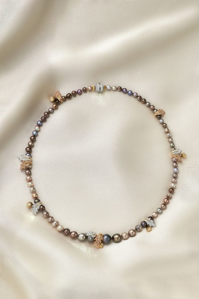Ribbons – Un hommage aux origines textiles de Schlumberger, avec un collier double brin en perles naturelles, magnifié par des rubans de diamants dans des teintes cognac, rose et jaune.